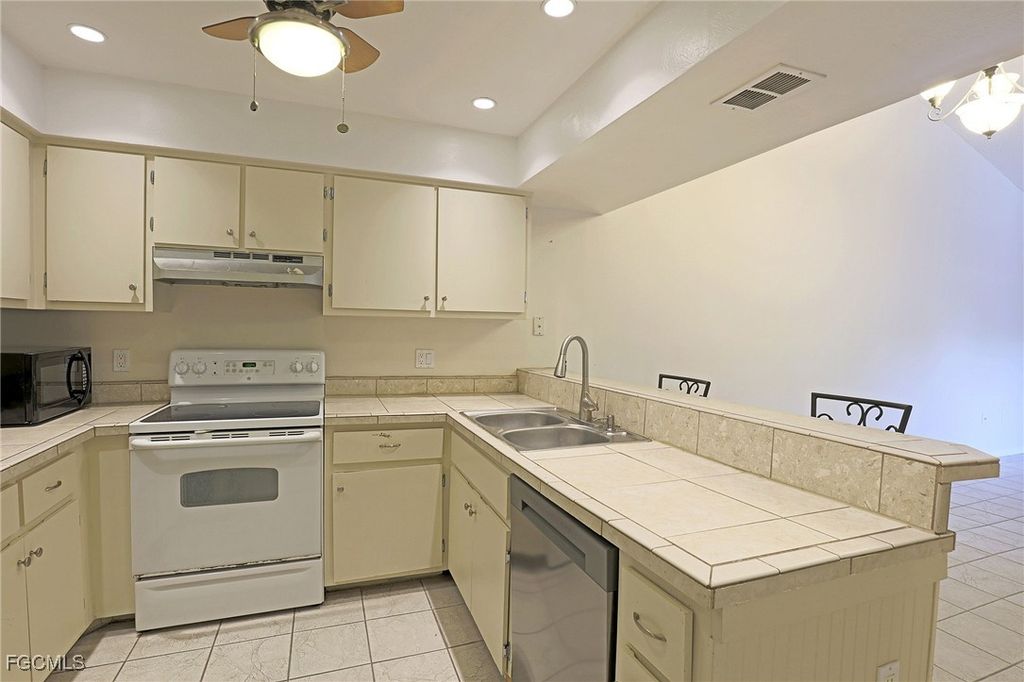 Soaring ceilings in the living and dining area create a spacious, open feel, enhanced by tile flooring throughout that's been professionally cleaned and move-in ready. The peninsula-style kitchen offers plenty of cabinetry and a breakfast bar for casual dining, while the nearby laundry area includes a full-size washer and dryer.