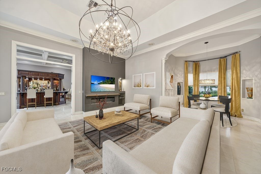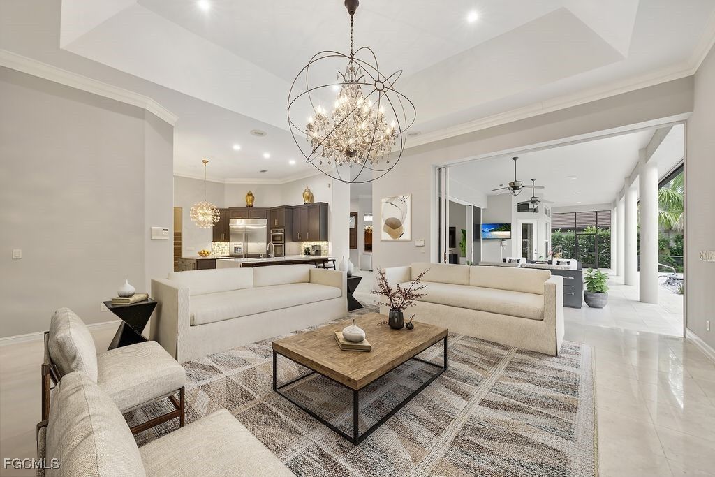 Exquisite estate home on an oversized corner lot in Edgewater, the premier neighborhood of Gulf Harbour Yacht & Country Club within a short walking distance to all of the wonderful amenities, including private island with Sandy beach, state of the art fitness facility and spa, and walking paths. This unique home is an entertainer's dream perfect for a family offering 5,767 square feet of total living space, including three en-suite bedrooms, a sauna, office/den, and a flexible bonus room that can serve as a fourth bedroom, and travertine marble flooring throughout the home as well as outdoor lanai. Two fireplaces and soaring lighted volume ceilings with large crown moldings throughout create a grand, light-filled ambience. The updated custom kitchen features gas,Viking stove, wood cabinetry, quartz countertops, oversized kitchen, a center island with breakfast bar, and a butler's pantry,all open to the family room and formal dining area. The main floor primary suite provides tranquil privacy with a spa-like en-suite, featuring a Jacuzzi jetted tub and two walk-in closets with built-in organizers. Enjoy Florida's resort lifestyle in your private backyard oasis: a expansive paver stone lanai with a pool, spa, outdoor kitchen, and a separate pool bath. Additional highlights include a 3-car oversized garage, newer roof, recently resurfaced, pool, and fresh exterior paint. Edgewater offers very low HOA fees and is within easy walking distance to Gulf Harbour Yacht & Country Club's amenities: Private beach,walking paths,national-ranked golf and tennis facilities and a 186-slip deep-water marina with direct access. This home also includes a 38-foot dock for sale in Gulf Harbour Marina and a transferable sports membership option to Gulf Harbour Yacht & Country Club,(not included in home sale) Schedule your private tour today and make resort living your everyday reality.