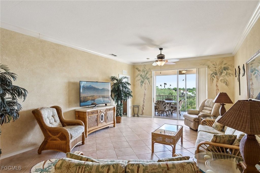 BUYERS HAD A CHANGE OF HEART! THEIR LOSS IS YOUR GAIN! Experience the best of Florida living in this beautifully furnished 2 bedroom plus den 2-bath condo on the 4th floor of The Terraces at Riverwalk, complete with a convenient common elevator. This turnkey home offers a spacious layout with tile and carpet flooring, in-unit laundry for everyday ease, a master suite featuring elegant tray ceilings and a private bath, and a screened lanai perfect for enjoying the breeze. The community boasts resort-style amenities, including a sparkling pool, fitness center, clubhouse with kitchen, library, billiards, table tennis, BBQ area, and onsite management. Perfectly situated near shopping, dining, parks, and endless entertainment, you'll be just minutes from Cape Coral Beach and only a short drive from the pristine shores of Fort Myers Beach and the scenic Sanibel Island Causeway.