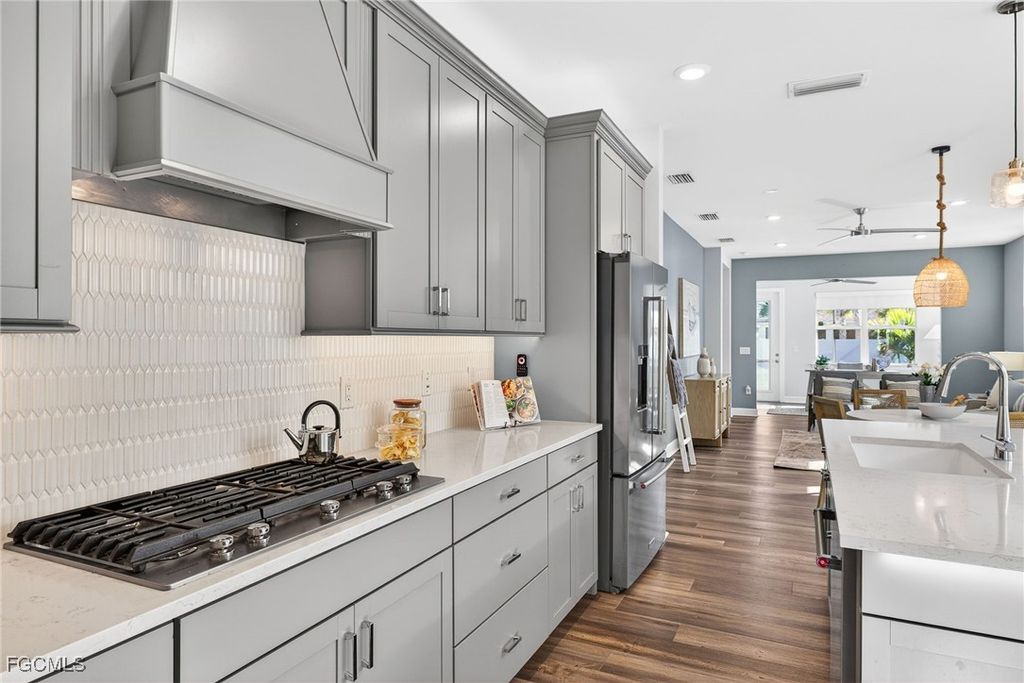 Step inside to find brand-new luxury vinyl plank flooring, 8-foot doors throughout, and a 4-foot garage extension for added space. The chef's kitchen is a showstopper, featuring a designer backsplash, LED under-cabinet and island lighting, KitchenAid appliances, a gas cooktop, and a built-in oven and microwave combination. Every detail was thoughtfully chosen for both style and function.