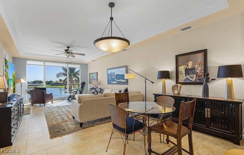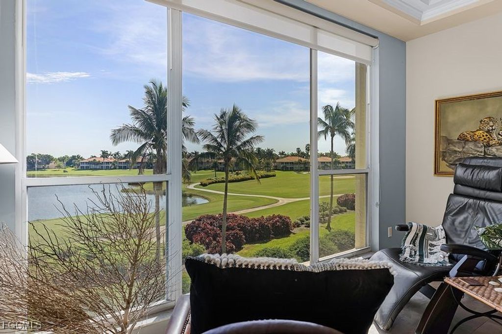 Panoramic Lake and Golf Course Views through Floor to Ceiling Window Wall. Bellavista 3rd floor Cortina Model with 2 Bedrooms, 2 Baths and Large Den in Prestigious Gulf Harbour Yacht & Country Club. White Kitchen with Granite Counters, Stainless Appliances, Breakfast Bar, all with a View. Living area has Ceramic Tile and Engineered Wood in the Den. Both the Living Room and Primary Bedroom Suite has access to the Tiled Lanai also with Great Views. Primary Bedroom has Private Bath with His and Hers Sinks, Shower and a Bathtub. Furniture-Furnishings negotiable, Crown Molding throughout, Tray Ceiling in Living Room, Den has 10 Pane Glass French Doors, Guest Bedroom and Den has Room Darkening Shades. Elevator to Large Breezeway with Storage Room right Outside the Front Door. AC and Stove New 2025, Water Heater is Tankless for Extra Storage, Full Size stacked Washer & Dryer, Big 2 Car Garage, Walk to Country Club and Marina. Square footage approximate or from Lee County. Some amenities herein available but not offered. If desired Country Club membership purchase is required for club amenities. Country Club Memberships available for purchase but not mandatory. See Attachments & Photos for information regarding the Renovation of the Country Club.