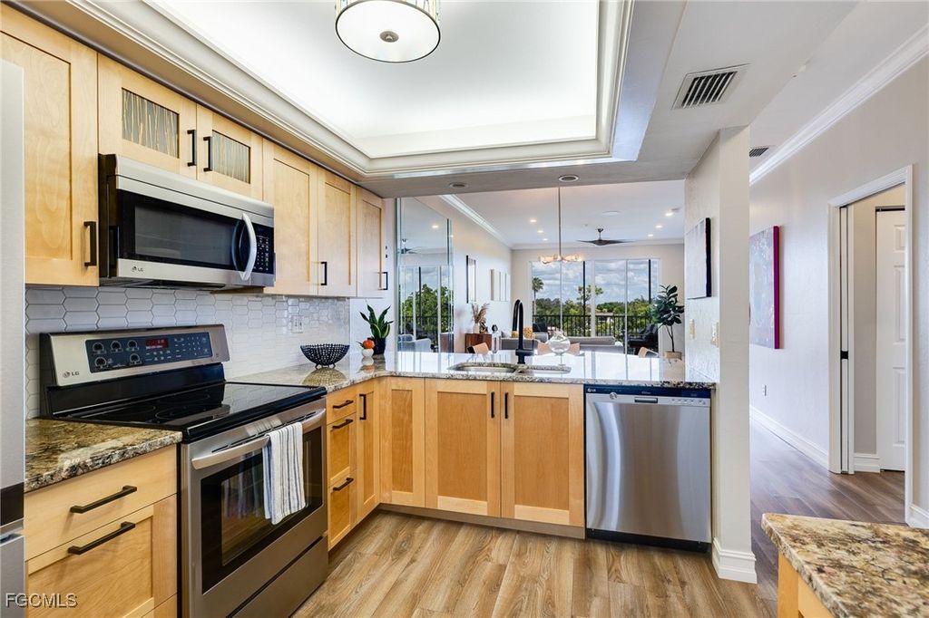 Discover this fully renovated 2-bed, 2-bath TURNKEY penthouse condo on the 4th floor of The Park at Lakewood, offering serene pond views from a spacious oversized lanai. This modern, move-in-ready home features luxury vinyl flooring, granite countertops, brand-new stainless steel appliances, completely updated bathrooms, and MORE. Enjoy added touches like a cozy electric fireplace, a pre-wired built-in speaker system (just needs final hookup), and automatic electric storm shutters for peace of mind. The community offers resort-style amenities including a pool overlooking the pond, clubhouse, pickleball, tennis, and a boardwalk through the preserve. A carport and extra storage are also included. With every detail thoughtfully upgraded, and major systems like the HVAC (3 years old) and roof (2 years old) in great shape, this condo is perfect for full-time living or a seasonal escape.