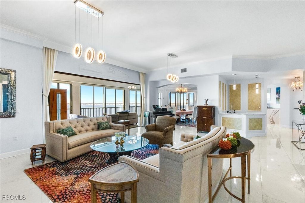 Welcome to this spectacular 8th-floor penthouse in Palmas Del Sol, located within the prestigious Gulf Harbour Yacht & Country Club. Offering a total of 4,421 square feet, this turnkey furnished property is the epitome of sophistication and comfort. This meticulously designed penthouse features 3 spacious bedrooms and 3.5 beautifully appointed bathrooms, each bedroom with its own ensuite bathroom. The grand master suite includes an expansive 420-square-foot private, open-air patio, providing the perfect space for relaxation. The ensuite bathroom is a serene retreat, complete with a jetted tub, large shower, dual sinks, and two walk-in closets. The gourmet kitchen is a chef's dream, outfitted with top-of-the-line GE Monogram appliances, including a 48-inch Subzero refrigerator, double wall oven, induction cooktop, and microwave. A KitchenAid dishwasher and 48-bottle wine fridge ensure every convenience is at your fingertips. The kitchen flows seamlessly into the wet bar area, perfect for entertaining guests. Adjacent to the kitchen, a formal dining room offers an elegant space for hosting memorable dinners. The 700-square-foot lanai has been thoughtfully converted into additional living space, offering panoramic views of the Caloosahatchee River from every room. The residence features stunning 48-inch floor tiles, adding a touch of elegance to the expansive living areas. This property also includes a two-car garage conveniently located under the building, ensuring secure and private parking. Residents of Palmas Del Sol enjoy exclusive amenities separate from the Gulf Harbour Yacht & Country Club offerings. These include a resort-style pool and spa, a clubhouse with billiards, a meeting room, a kitchenette, a big-screen TV, and a BBQ area, providing everything needed for a vibrant and social lifestyle. Gulf Harbour Yacht & Country Club offers the ultimate in luxury living with access to world-class amenities, including a private marina, championship golf course, fitness center, and dining options. With its prime location, breathtaking views, and unmatched amenities, this penthouse is a true gem in one of the most sought-after communities in Southwest Florida.