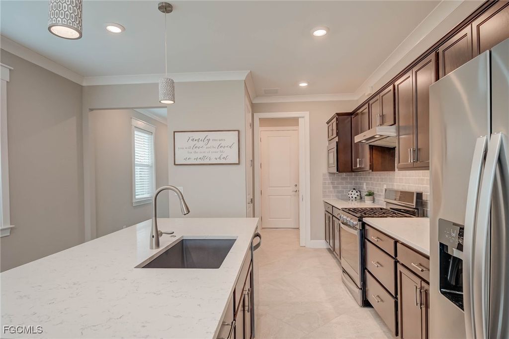 Quartz countertops, crown molding, & 8-ft doors