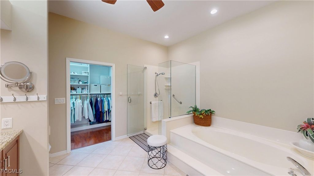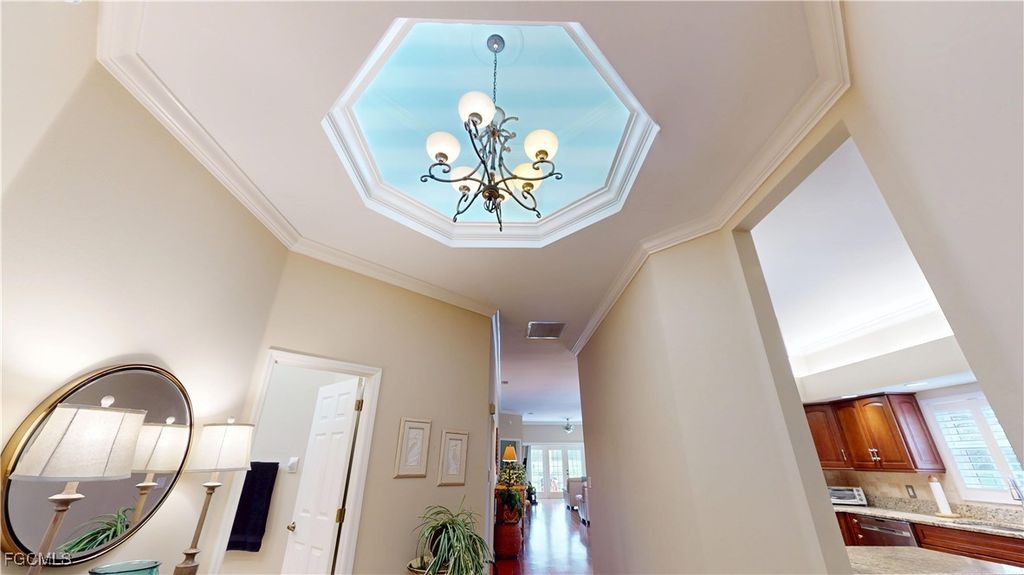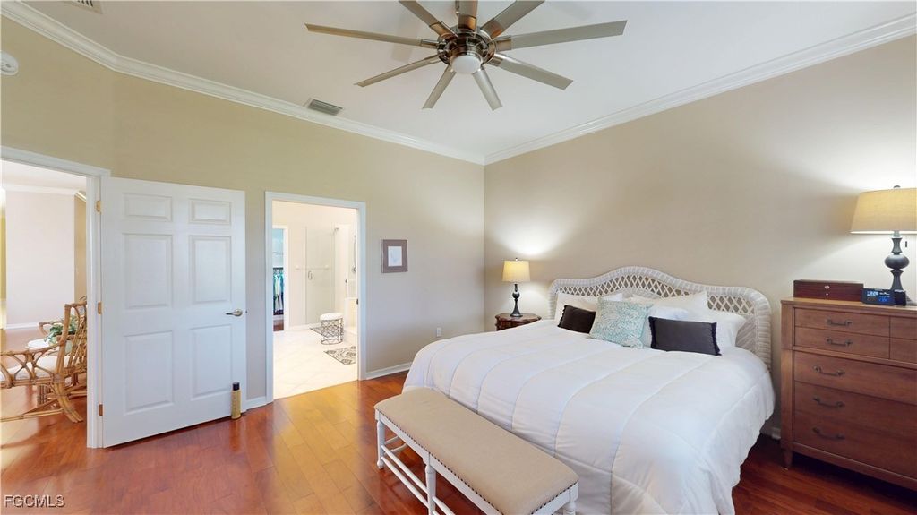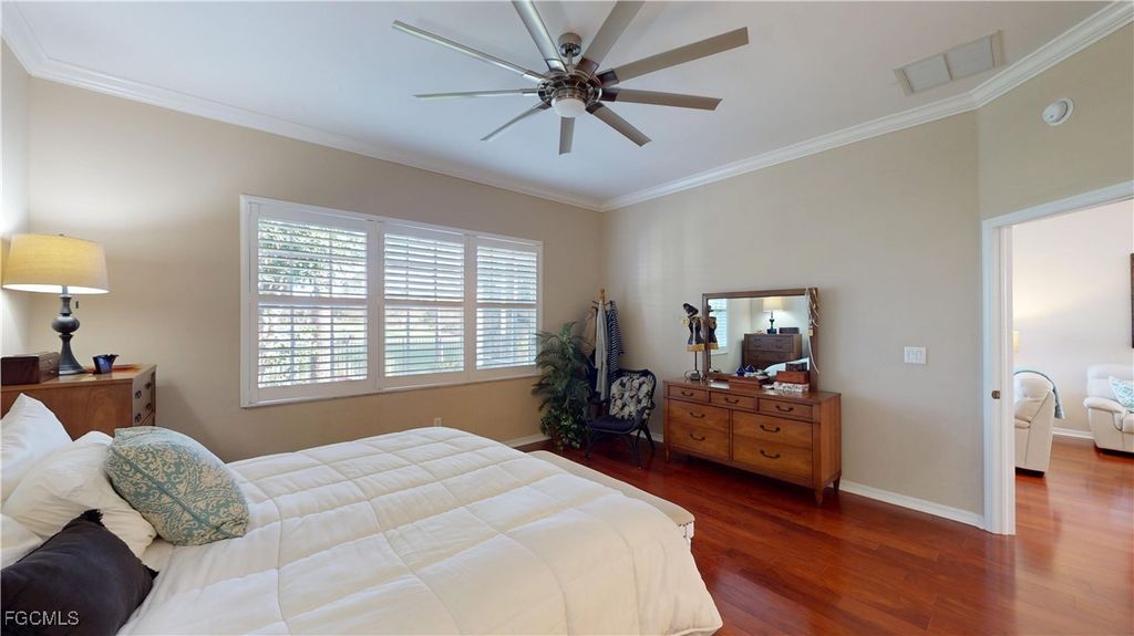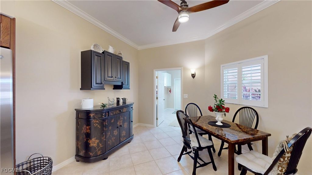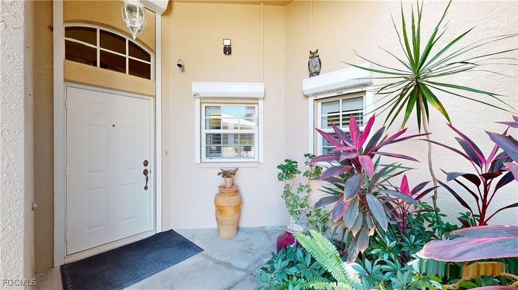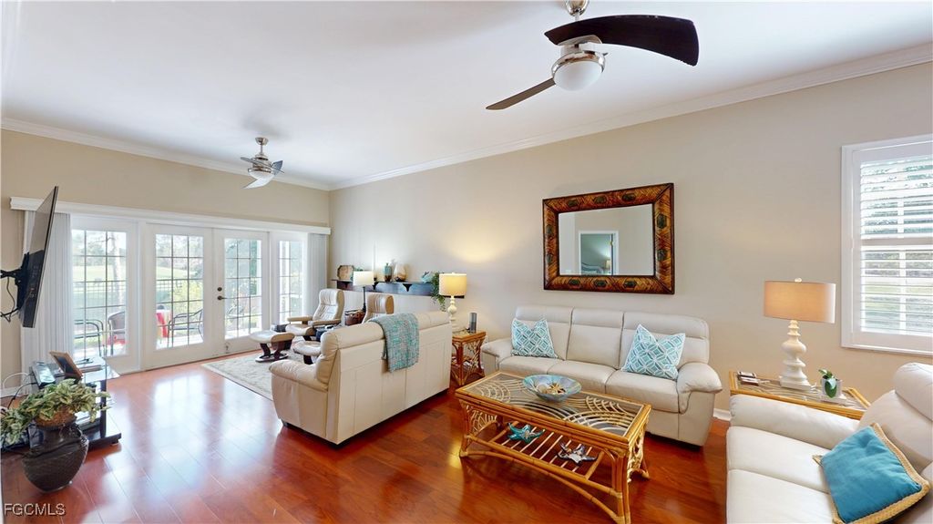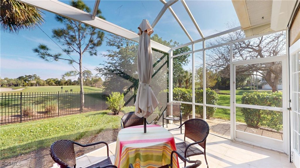 Welcome to this charming 2-bedroom, 2-bathroom villa with a den, perfectly situated with a serene view of the Cypress Lake Golf Course. This home features tile and laminate flooring throughout, offering a sleek, low-maintenance appeal. The kitchen is a chef's dream with beautiful granite countertops, stainless steel appliances, and an inviting eat-in kitchen area. The guest bath includes a convenient tub-shower combo. The spacious master suite boasts an ensuite bath with dual sinks, a garden tub, walk-in shower, and a large walk-in closet. The den, with French doors, features a built-in desk area and a closet, offering a versatile space for work or relaxation. Step outside through French doors to the screened-in patio and enjoy the stunning golf course views. This home is complete with crown molding throughout, electric and manual shutters for added protection, and a two-car garage. This community is close shopping and entertainment including the beaches and the historic downtown area,, Experience comfort, convenience, and luxury in this beautiful villa!