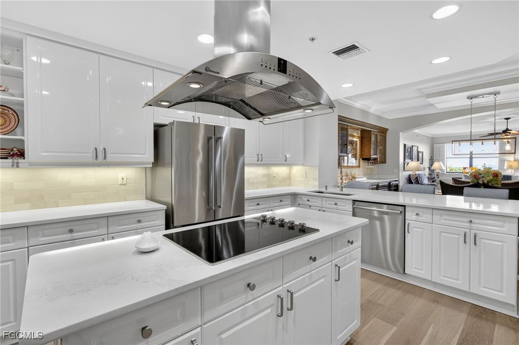 Featuring 3 bedrooms and 2.5 baths, the split floor plan provides both privacy and seamless flow for everyday living or entertaining. Rich wood floors span the main living areas and bedrooms, while luxury tile enhances each bathroom. The kitchen impresses with quartz countertops, a sleek cooktop island with hood, and premium KitchenAid stainless steel appliances (installed in 2020). A built-in buffet and custom cabinetry add an elegant touch to the open-concept living and dining areas.