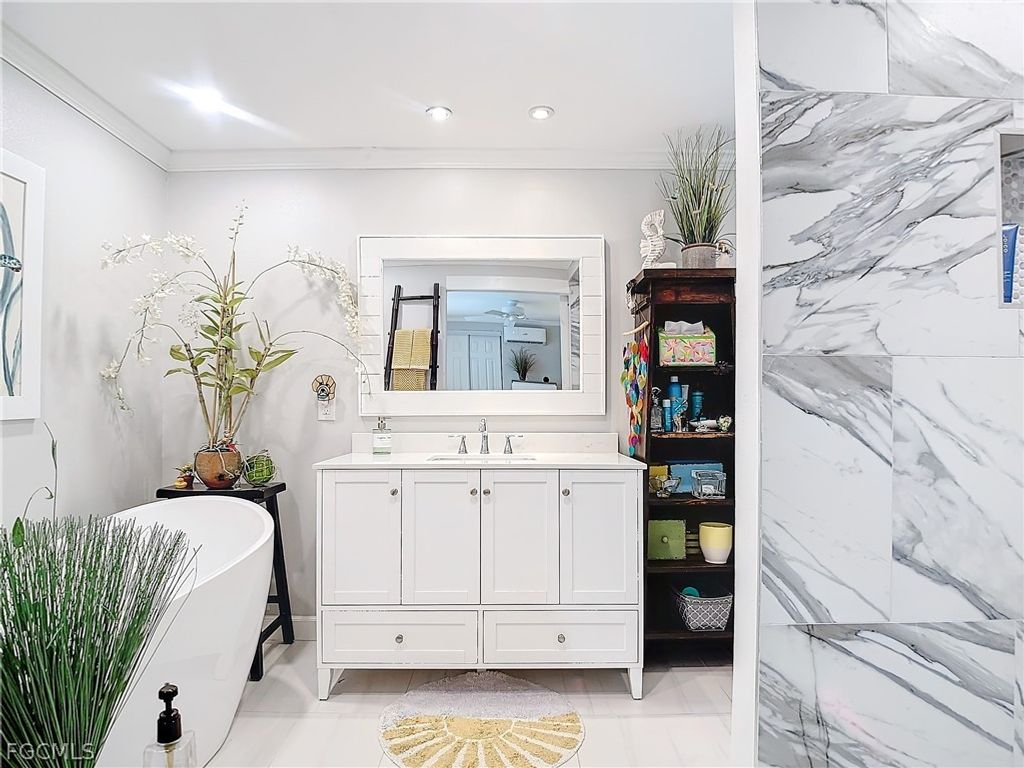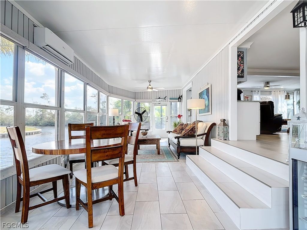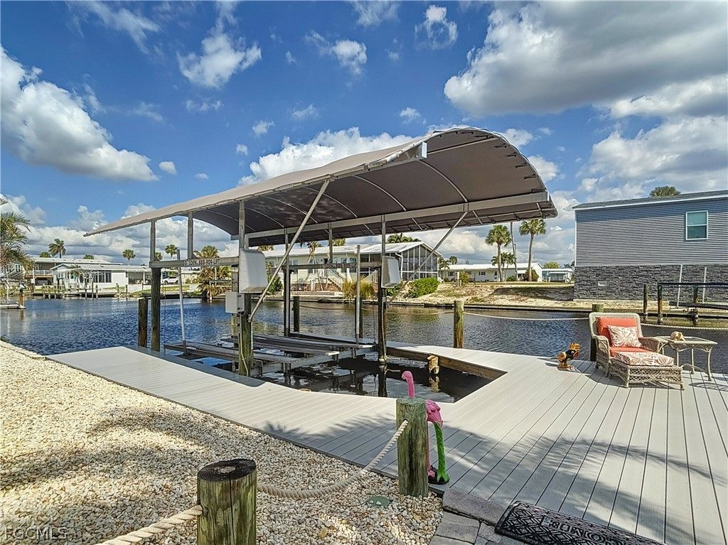 Rare opportunity to own a premier Bayside point corner lot with coveted southeastern exposure on a canal"”offering over 150 feet of seawall and a setting that is seldom available. Located in Bayside Estates, a highly sought-after 55+ community known for its vibrant lifestyle and outstanding amenities, this extensively updated 2-bedroom, 2-bath home delivers the ultimate coastal vibe and waterfront living experience. No corner has been untouched, featuring ¾" plywood subflooring, ¼" cement board screwed (not nailed), beautiful porcelain flooring, new windows with marble sills, crown molding, 4" baseboards, recessed lighting, and updated electrical. The primary bath offers a European soaking tub for a spa-like retreat. Outdoor living is designed for both relaxation and entertaining, with a heated 60,000 BTU saltwater Gunnite pool, bronze custom enclosure, remote-controlled lanai blinds, electric hurricane shutters, Tiki hut with outdoor kitchen, Azek decking, professionally designed zero-scape landscaping, and serene preserve views. Wine and dine, host gatherings, or simply unwind while boats cruise past"”this property offers multiple spaces to enjoy the waterfront lifestyle. Boating enthusiasts will appreciate the new stringers and 10,000 lb boat lift with canopy, and there is 50-amp service for a motorhome along with a 12x20 garage for additional storage or workspace. Just 2.5 miles from Estero Island with convenient access to beaches, dining, and shopping, this home blends privacy, luxury, and accessibility. Bayside Estates features amenities including tennis, community pool, clubhouse, live music, bingo, card nights, and a wide variety of organized activities. Premier point lots like this are rare"”secure your waterfront retreat before it's gone.