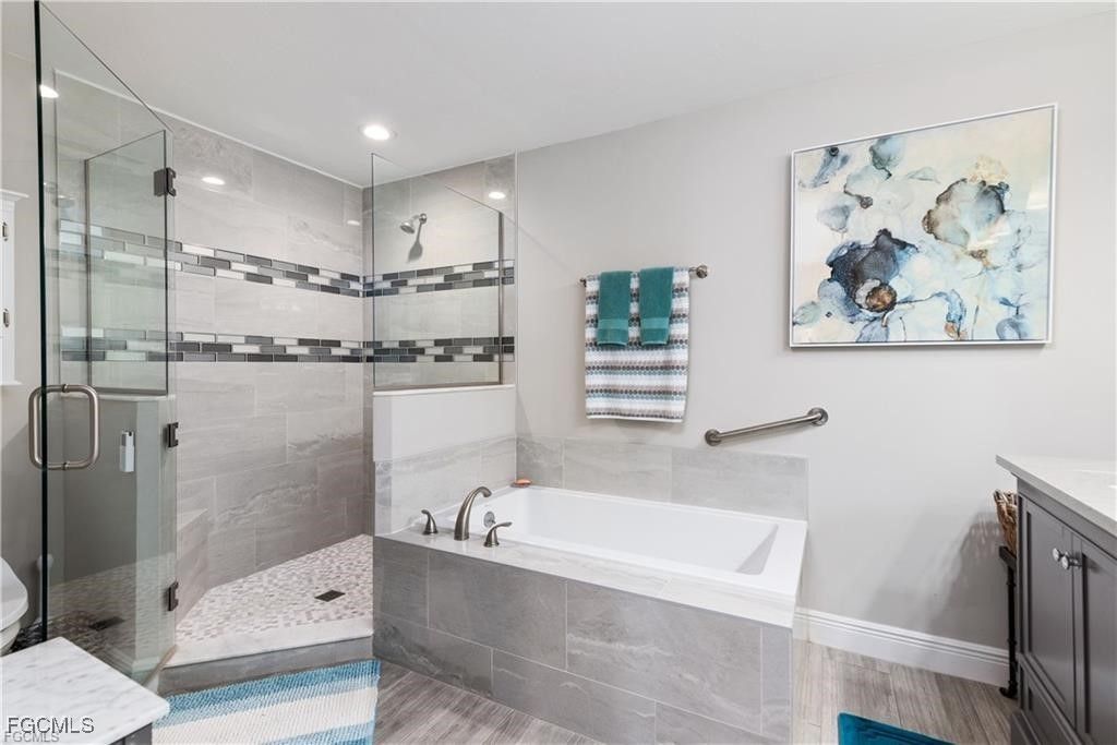 The spacious, absolutely gorgeous, open kitchen is a true highlight, featuring custom countertops and cabinetry, as well as stainless-steel appliances. Tile flooring flows throughout the home, enhancing the clean, modern feel. Relax or entertain on the screened lanai overlooking the golf course, where you can enjoy tranquil views year-round.