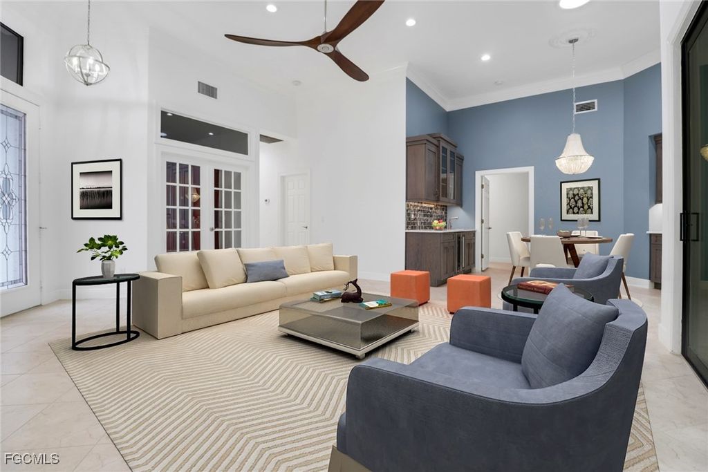 Outside, enjoy beautifully landscaped grounds perfect for relaxing or entertaining guests, while offering the utmost privacy. This home delivers turnkey perfection"”no detail overlooked and nothing left to do but move in and fall in love. Located in a gated country club community that offers it all....unlimited golf no greens fees, tennis, pickle ball, fitness center, bocce, walking and biking trails, kayaking, dining and 192 wet slip marina and additional dry storage. Minutes from fabulous area restaurants, various theaters and comedy clubs, shopping and not to mention the famous white sandy beaches of Sanibel island and Ft. Myers Beaches. International airport only 20 minutes away