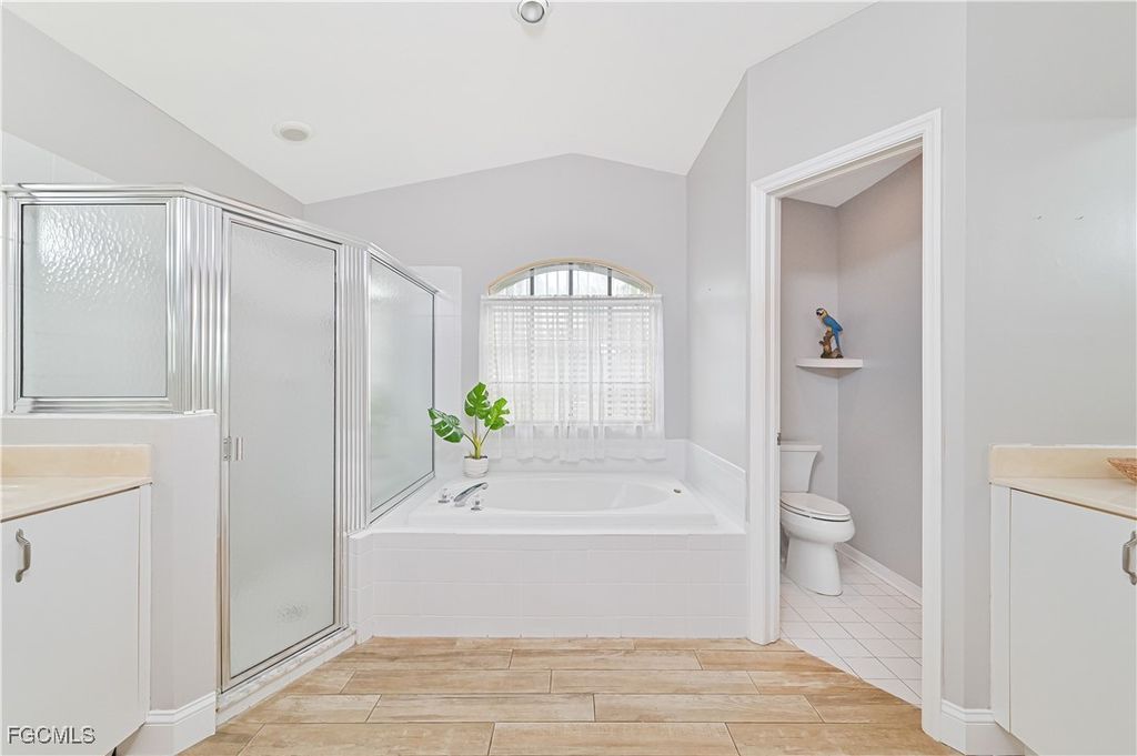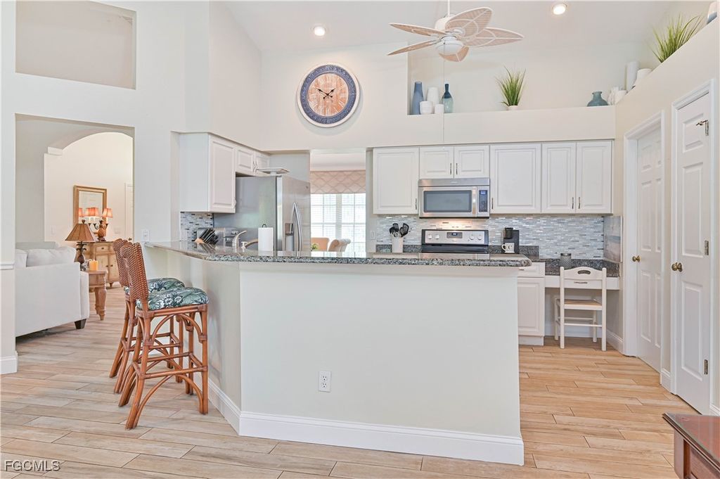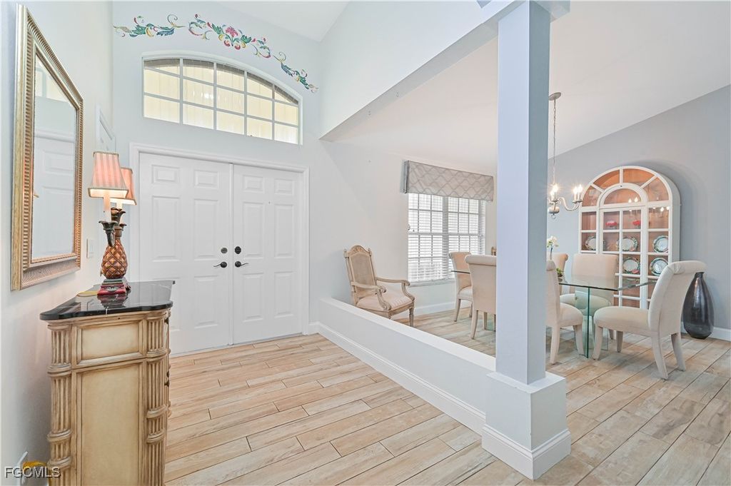 The Grove at Parker Lakes - extremely desirable, fabulous neighborhood. Enjoy Florida living in this well-cared for 3 bedroom 2.5 bath single family home in a super quiet cul de sac with a peaceful, sunset view. Water birds, bald eagles, osprey, turtles and even an occasional alligator may visit the lake out back! Enter the front door into a large living room/dining room with sliding glass doors opening onto an enormous lanai. Immediately to the right is a spacious primary bedroom complete with two walk-in closets and an amazing bathroom. Pass through the living room into a warm and welcoming kitchen and large family room. This home is filled with tons of Florida sunshine! Windows and sliding glass doors are everywhere providing access to the oversized lanai overlooking the lake. Two generous bedrooms (one with a Murphy bed), a guest bath and half bath compliment this wonderful home. You'll immediately notice the paver driveway and walkway entry as well as beautiful upgraded porcelain tile floors throughout. No need to worry about landscaping during the dry season - there's a well with a newer pump for irrigation. A home warranty and a flood insurance policy are easily transferrable to new owners which will save money considerably. Hurricane shutters provide protection and also insurance savings. Some furnishings are negotiable. Very low HOA fees of $650/quarter pay for basic cable, internet and all the amenities Parker Lakes offers. Splash in the resort-style pool, exercise in the lap pool or visit the pool in The Grove. Like fitness? Try out pickleball and tennis courts, fitness center, basketball, racquetball, shuffleboard and even a playground for the kiddos. The community park has walking path and even a fishing pier. Take a look... You'll fall in love.