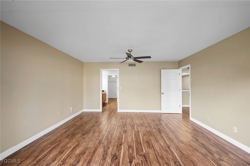 The open-concept layout flows seamlessly into the master suite, which boasts dual sinks and a walk-in shower for a spa-like experience. Enjoy serene views of the water feature and direct access to the community pool, making relaxation effortless.
