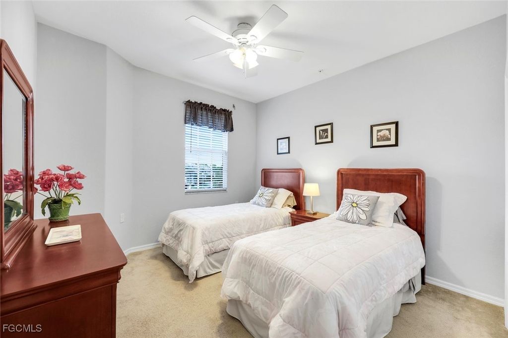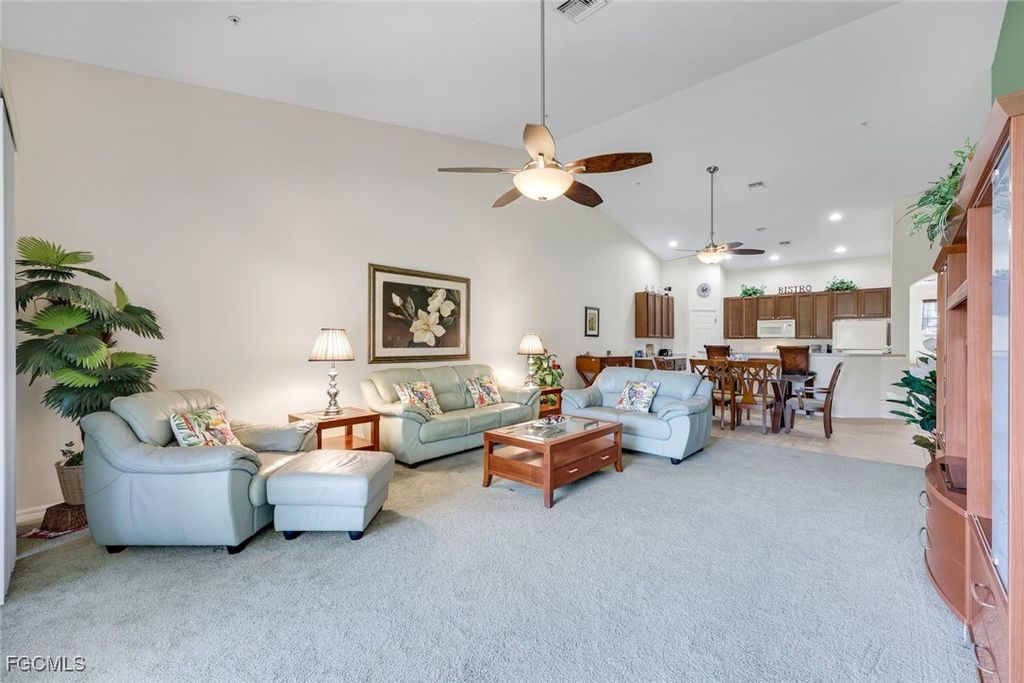 Turnkey and bright 2-bedroom, 2-bath condo with loft in the gated community of Calusa Palms, just about 15 minutes from Fort Myers Beach and close to shopping, dining and healthcare. This beautifully maintained home has been used only three months a year since new, feels barely lived in and is sold fully furnished (excluding personal items), allowing for immediate move-in. The open and airy layout is enhanced by cathedral ceilings, and the loft space works perfectly as a home office or guest area with pull-out sofa and desk. The comfortable furnishings include a newer adjustable king-size bed with headboard, leather sofa and loveseat, pub chair and an entertainment center with TV. The owner-friendly primary suite offers a lockable owner's closet inside the walk-in, a relaxing garden soaker tub, and a new comfort-height toilet. The kitchen is fully stocked and ready for entertaining, and the private lanai features a wicker lounge chair and a durable Woodard fiberglass patio set. Peace of mind comes from recent replacements of the HVAC, water heater, dishwasher, garbage disposal and garage door opener; the building roof is approximately four years old. Permanent retractable hurricane shutters on all windows, a sprinkler system and 10-year smoke detectors provide added security. The interior presents fresh paint, new carpeting and ceiling fans in all major rooms, and the residence includes a lockable garage. Located far enough inland to avoid coastal storm impact, the property sustained no hurricane damage other than minor landscape cleanup. If you are looking for a meticulously cared-for, turnkey condo in a prime south Fort Myers location near world-class beaches and daily conveniences "” this is it.