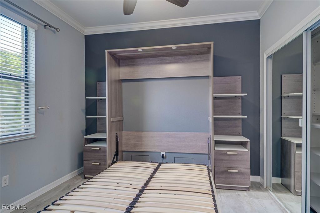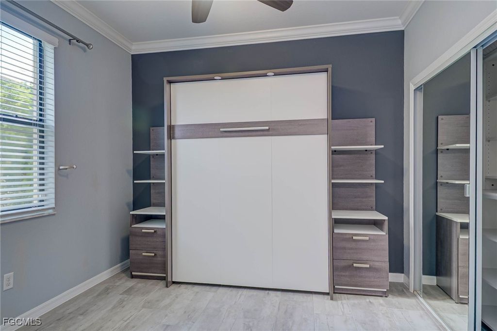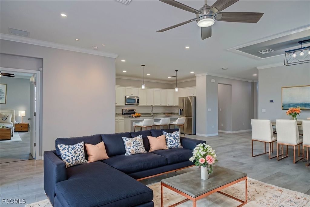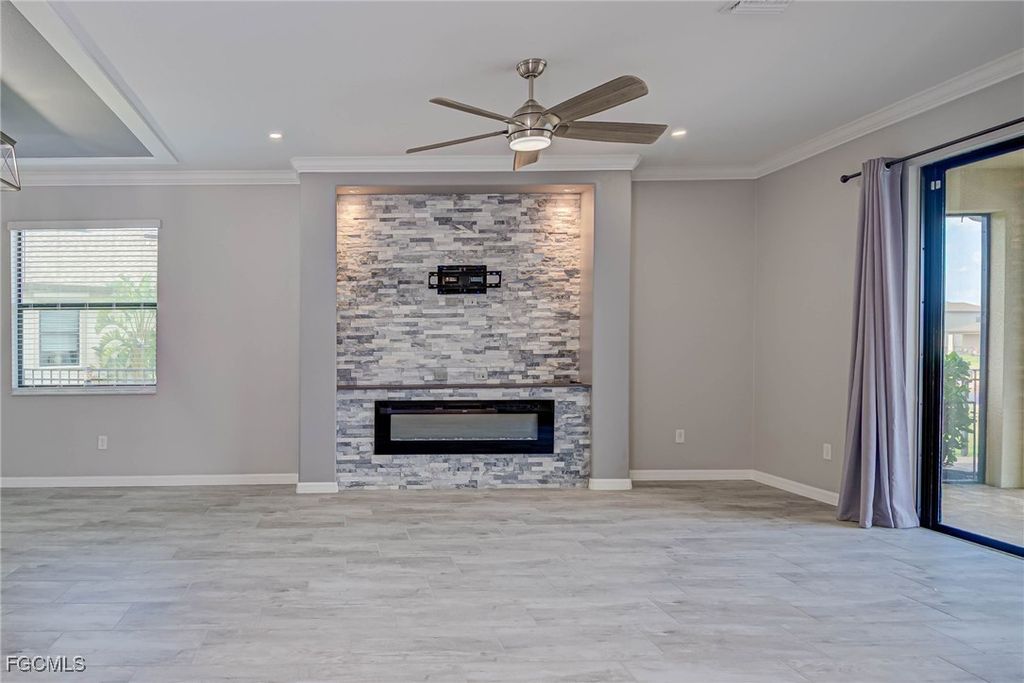 The living area includes a custom built-in media wall with an electric fireplace, creating a warm and inviting ambiance. Step outside to your private screened lanai where a heated pool awaits, perfect for relaxing or hosting friends while enjoying the tranquil water views.