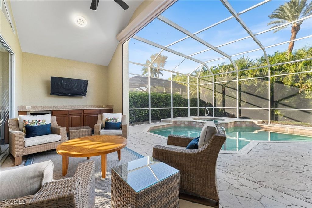 The primary suite offers a peaceful retreat with direct lanai access, generous closet space, and a well-appointed bathroom. A second bedroom is also located on the first level. Upstairs, a private guest bedroom is paired with its own flex space, perfect for a reading lounge, fitness nook, office corner, or additional guest living area. The split-bedroom design ensures comfort and privacy for all. All three bedrooms are ensuites which is perfect for privacy and functionalityYour own private outdoor oasis awaits you!The screened lanai features a pool and hot tub, a built-in outdoor buffet with refrigerator, and an outdoor TV, making this space ideal for entertaining, dining, or relaxing year-round. Whether you're enjoying quiet mornings or hosting gatherings, the outdoor area is designed to elevate everyday living.