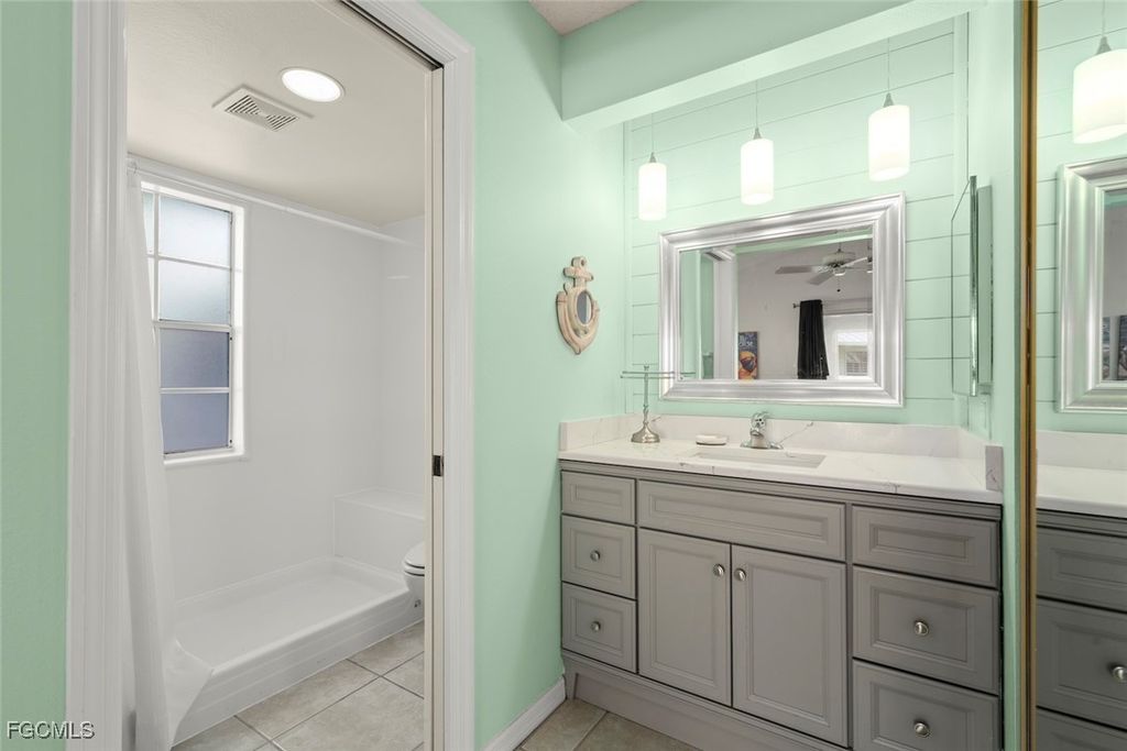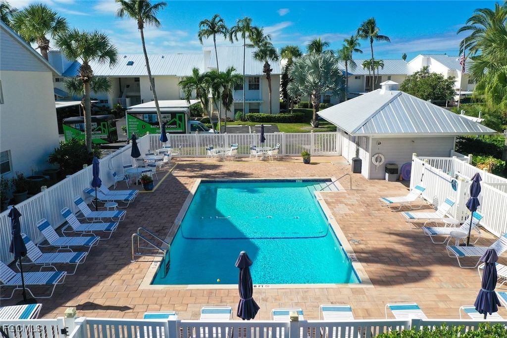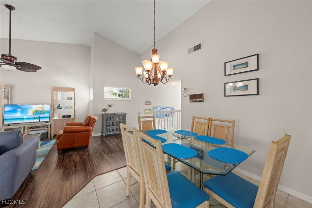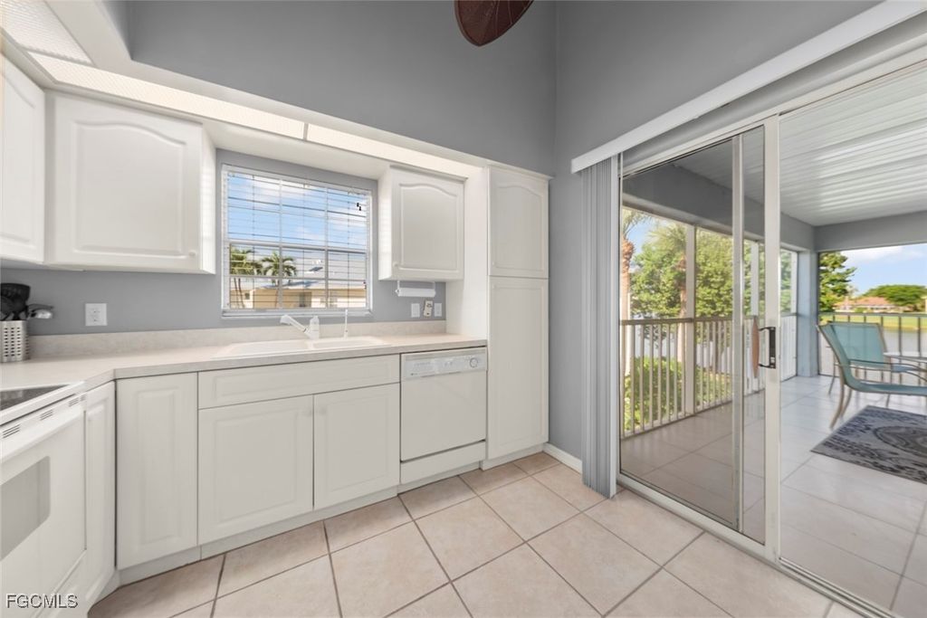 SUNLIGHT POURS IN OFF THE GLISTENING LAKE. Second floor end unit with windows seemingly everywhere. Located in the Rivers Edge Community of prestigious Gulf Harbour Golf and Country Club in Southwest Ft. Myers. The living room, kitchen and primary bedroom are wrapped around the huge screened lanai with the sliding doors forming a corner of glass that allows the spectacular water view to sparkle through virtually the entire unit. Vaulted ceilings increase the open feeling. Laminate flooring thru the living area with Berber carpet in the bedrooms. Updated kitchen with granite countertops and lazy Susan lower units. Primary bedroom accommodates a king bed plus supporting furnishings. Large walk-in closets. Updated bath. Large closets in both guest bedrooms, one with a conventional bedroom set and the other with bunk beds and pull-out trundle. Stacked washer and dryer with utility closet adjacent to bedrooms. Updated guest bath. Dining area overlooks water view. Covered reserved parking. Guest parking nearby. Just a few steps to the community pool and spa. Sold completely turnkey with classic comfortable furnishings so it is move-in ready, either as a winter hideaway or great seasonal rental. Miles of pathways inside the gate to enjoy bike rides, jogging, or casual walks in the sunshine. Close to Ft. Myers Beach, Sanibel Beach and nearby Bunche Beach. Or simply stroll the private Gulf Harbour Eagle Perch Island for gorgeous sunsets. Surrounded by shopping and restaurants. Easy access to SWFL International Airport, plus Twins and Red Sox baseball stadiums. Additional amenities of golf, tennis, fitness center and two restaurants require an optional membership, now available at a surprisingly low fee.