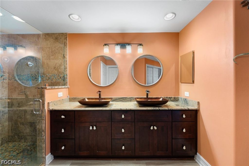 The spacious primary suite enjoys direct lanai access and features a beautifully updated ensuite bath with dual vessel sinks, granite countertops, and a sleek walk-in shower with seamless glass enclosure. A split floor plan ensures privacy, offering two generously sized guest bedrooms and a fully updated second bath with a vessel sink and granite vanity"”ideal for hosting family and friends.