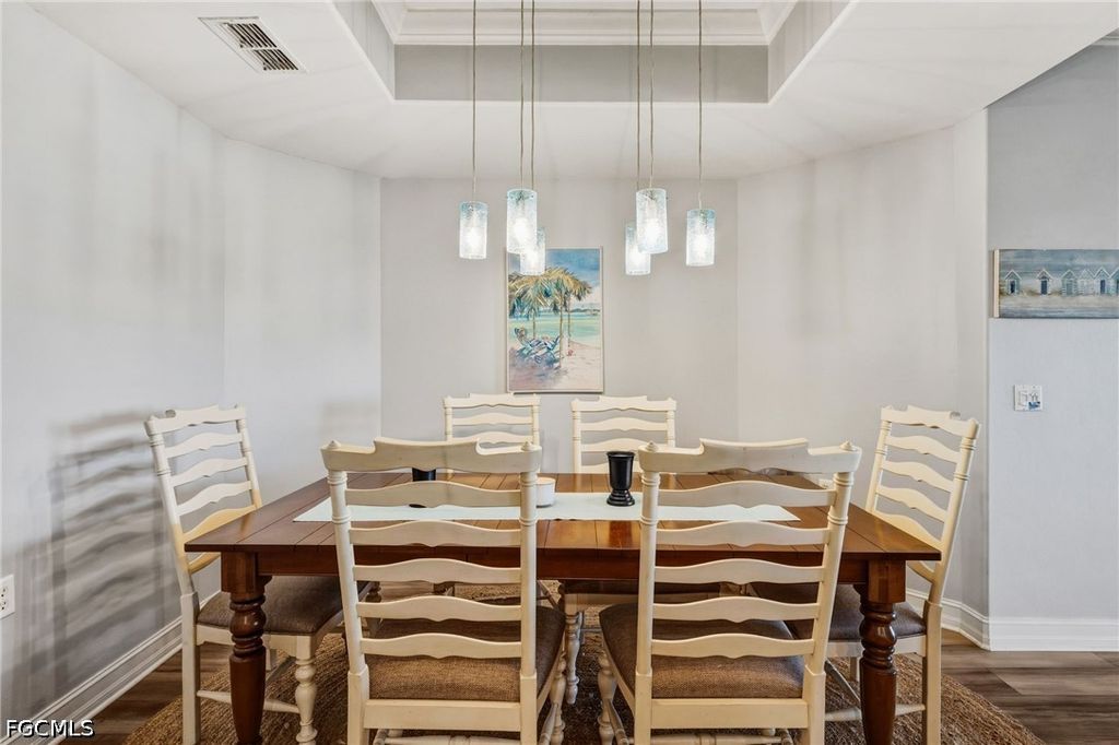 Thoughtfully remodeled, the kitchen showcases elegant quartz countertops, crisp white shaker-style cabinetry, stainless steel appliances, and a striking blue subway tile backsplash"”blending timeless design with modern sophistication. Luxury vinyl flooring flows seamlessly throughout the home, complemented by crown molding and custom lighting accents in the kitchen and dining areas.