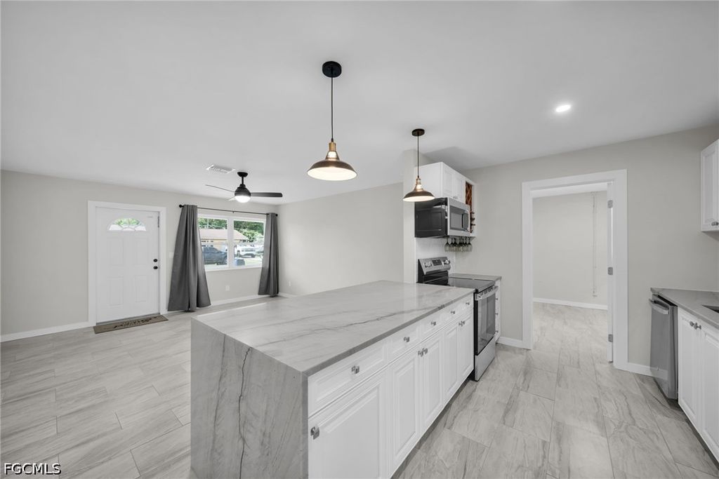 Move-in ready and beautifully renovated, this home is a rare find in the desirable Fort Myers Shores neighborhood. Located outside of the flood zone and not affected by Hurricane Ian, it offers both peace of mind and modern comfort. Recent upgrades include a new roof (2025), new A/C ducts (2026), impact windows, and a completely updated interior. The kitchen features elegant quartzite countertops with a striking waterfall edge, brand-new high-end soft-touch cabinetry, and never-used appliances. New tile flooring flows throughout the home, complemented by fresh interior and exterior paint, new doors, and updated window treatments.