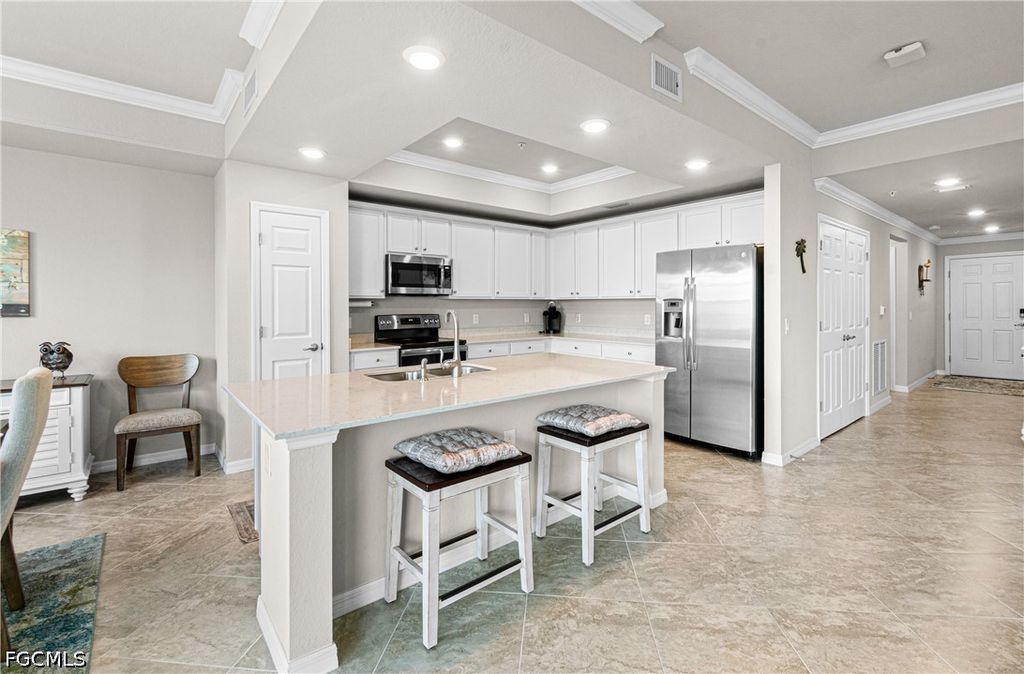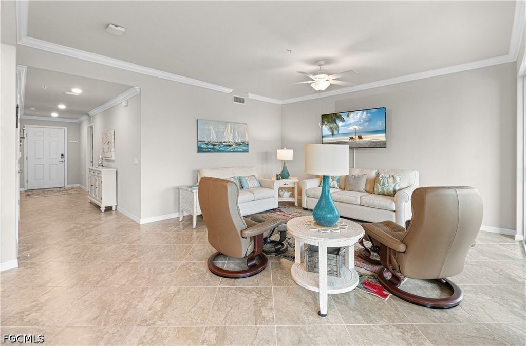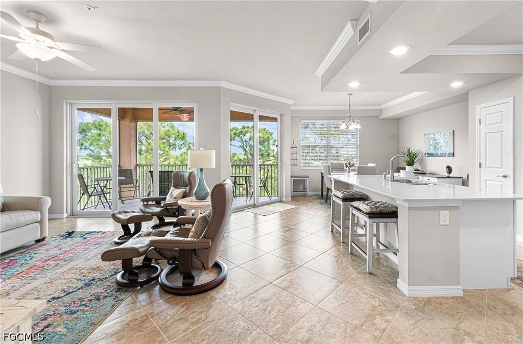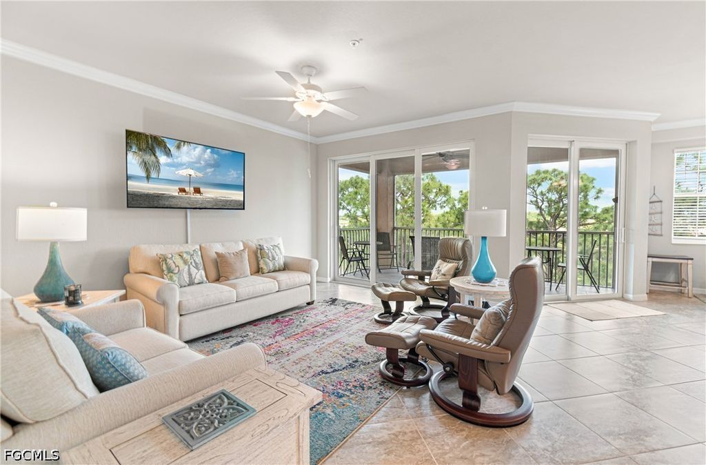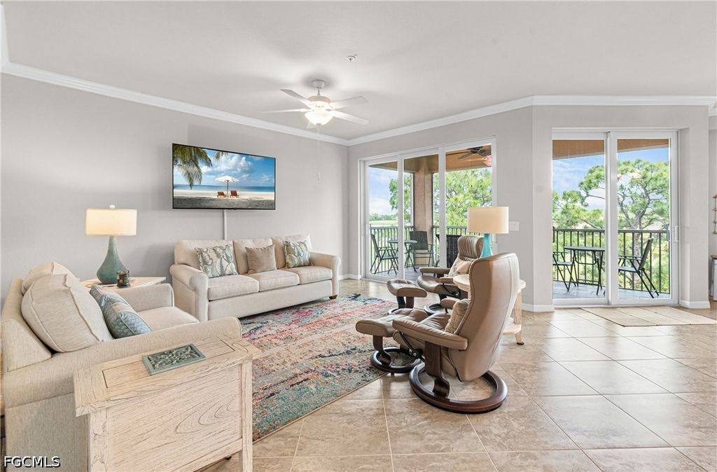 Turnkey Tivoli model, 4th floor condo in Palazzo at Pelican Preserve featuring stunning golf and lake views. This highly desirable floor plan offers an open concept layout that lives like a single family home, providing both space and comfort with staggered tile throughout.