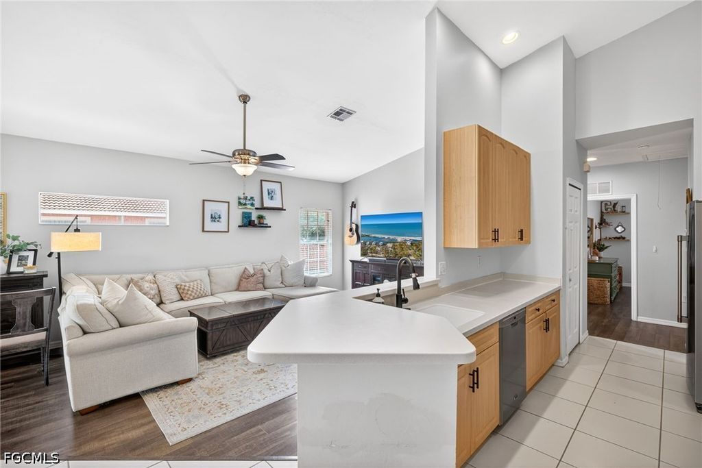 Inside, the open layout and vaulted ceilings give the main living space a bright, spacious feel. The home has been updated throughout with luxury vinyl flooring and tile with no carpet, making it both clean and low maintenance. The kitchen has been refreshed with newer appliances and connects easily to the living and dining areas, making the space practical for everyday use.