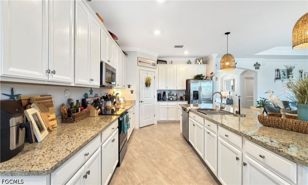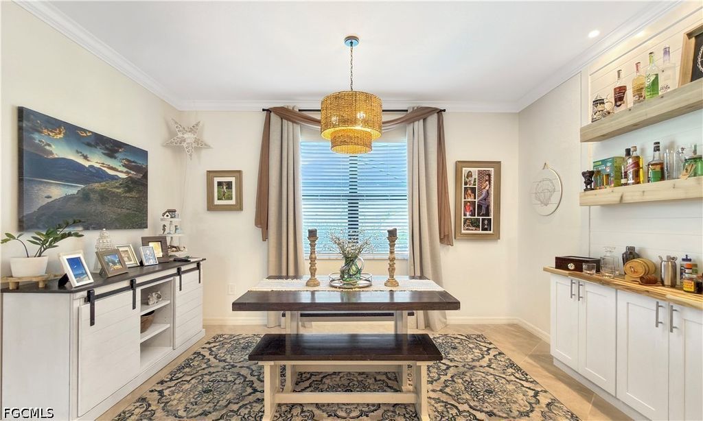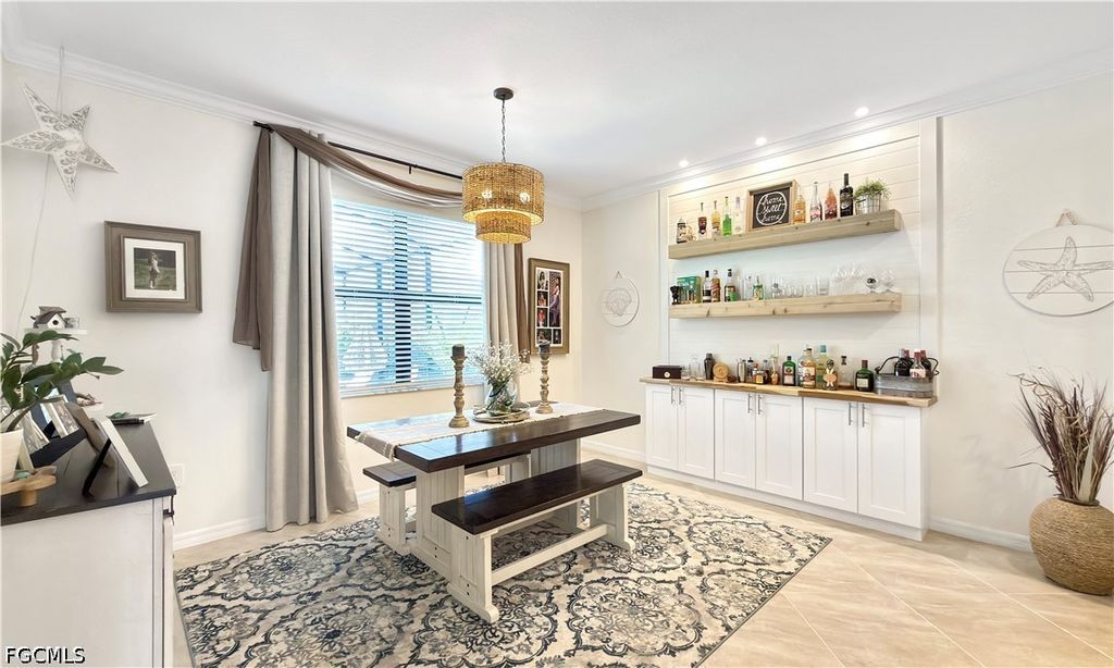 At the heart of the home, the kitchen impresses with an OVERSIZED CENTER ISLAND, GORGEOUS LIGHTING, WALK-IN PANTRY, WHITE CABINETRY WITH 42" UPPER CABINETS, GRANITE COUNTERTOPS, BUILT IN WET BAR, AND STAINLESS-STEEL APPLIANCES. Just off the kitchen, the dining area overlooks the backyard and lake, creating a bright and inviting atmosphere.