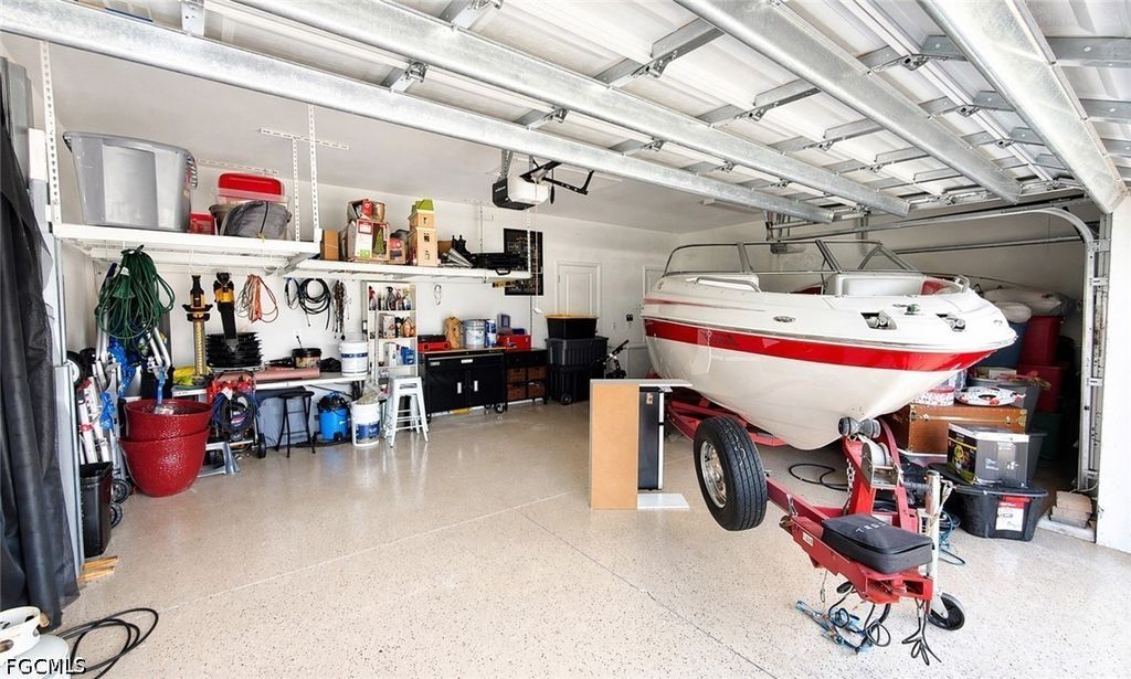 Additional features include EPOXY GARAGE FLOORS WITH OVERHEAD STORAGE RACKS, EXTERIOR ROCK ACCENTS, AND CALOOSA HEDGES.