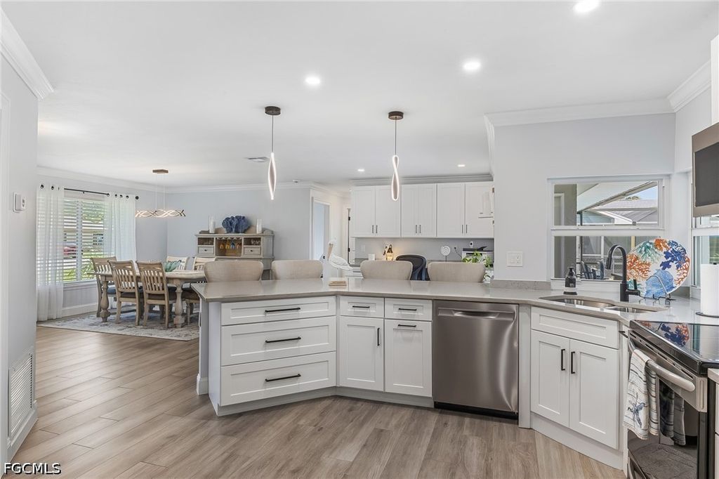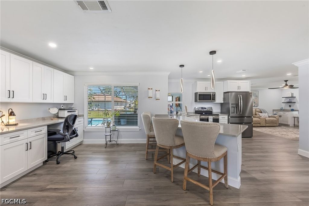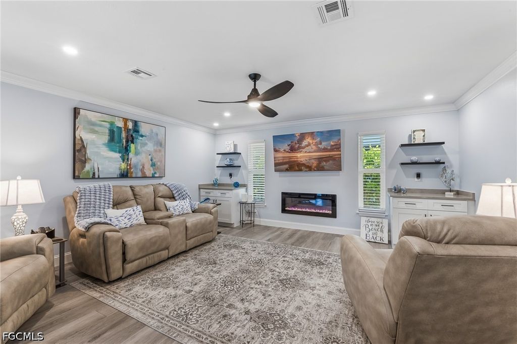 Enjoy the best of Southwest Florida living with this beautifully remodeled pool home in the highly desirable Woodlands boating community"”featuring quick, direct access to the open Gulf and just a scenic 25-minute boat ride to Lover's Key from the community ramp and dock. Step inside and experience a bright, open-concept interior designed for modern coastal living. The main living space is elevated by elegant plank tile flooring, crown molding, tall baseboards, and ambient LED ribbon lighting that creates a warm, inviting atmosphere. A remote-controlled electric fireplace with customizable color settings and custom cabinetry with quartz adds both style and comfort, making the living area a true focal point. The stunning kitchen is the heart of the home, featuring crisp white Shaker cabinetry, sleek quartz countertops, and a spacious coffee bar"”perfect for everyday living and entertaining. New stainless steel appliances, including a range with convection and air fryer settings, bring both convenience and performance to this thoughtfully designed space. Both bathrooms have been fully updated to offer a spa-like feel, complete with modern vanities, quartz countertops, LED-lit mirrors, and beautifully tiled custom showers. Beyond its impressive interior, the home has been comprehensively upgraded within the past three years, including a new roof, insulation, HVAC, water heater, plumbing, and electrical wiring. Hurricane-rated impact glass on all windows and doors provides added security and efficiency, while new ceiling fans and light fixtures complete the home's fresh, modern look. Step outside to your private retreat, where a heated pool, expansive deck, and outdoor wet bar make entertaining effortless. The Woodlands community offers low HOA fees of just $240 per year, larger lots, and minimal restrictions"”allowing boats and RVs. Residents enjoy access to amenities including a boat ramp, dock, pickleball, tennis, basketball, and a playground, along with community events like the 4th of July golf cart parade, Harvest Festival, and Easter egg hunt. Move-in ready and thoughtfully upgraded, this home offers the perfect blend of modern interior style and relaxed coastal living. Most furniture available to purchase separately.