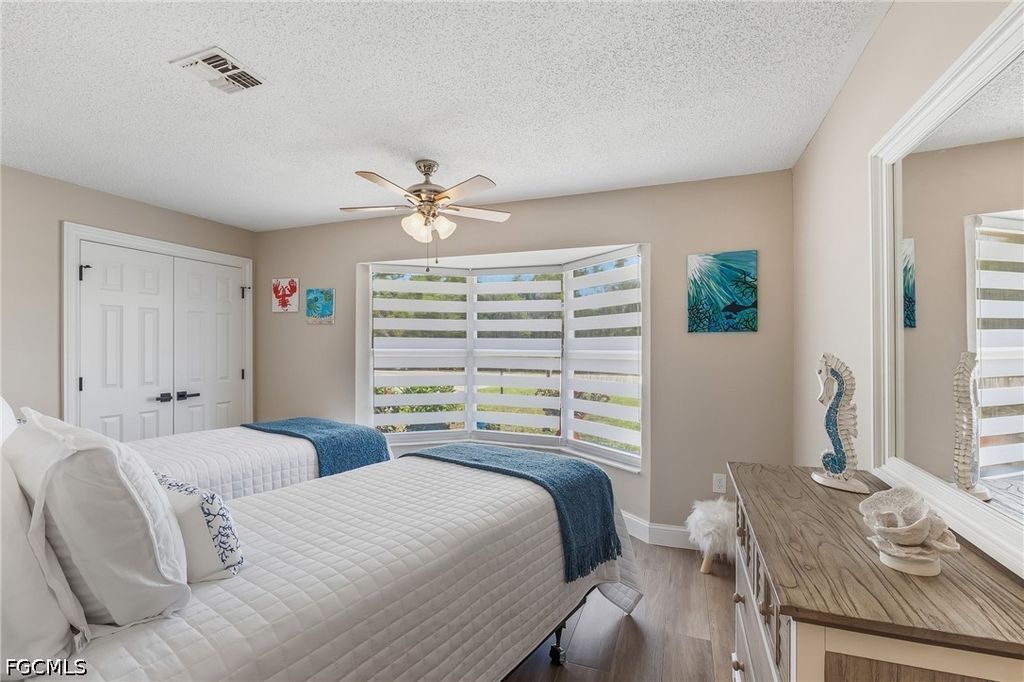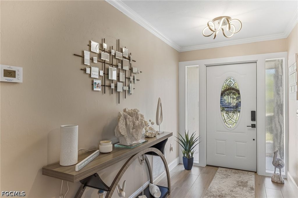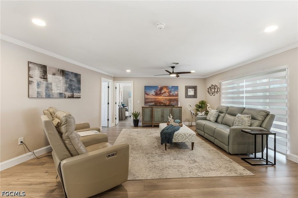 The kitchen flows seamlessly into the dining and living areas, where oversized windows and doors flood the space with natural light and provide tranquil views of the pool and canal. The split-bedroom layout offers privacy, with a guest bedroom and full bath on one side, while the primary suite"”with en-suite bath"”and an additional guest bedroom featuring a bay window are situated on the other. Step outside to your private oasis, where a spacious and brand-new paver deck surrounds the heated pool and offers both shaded and sun-filled lounging areas. The screened lanai has a wet bar perfecting for outdoor entertaining. The dock, complete with a seating area and electric, creates the perfect setting to enjoy peaceful waterfront views or prepare for your next boating adventure. Additional upgrades include plank tile flooring throughout, crown molding, tall baseboards, custom window treatments, and high-end lighting and fans. Major system updates all done within the last 3 years provide peace of mind, including a new HVAC (2023), water heater, full electrical rewire, all-new plumbing, pool pump (2026), electric pool heater and a new epoxy garage floor and entry (2026), new pool screens. The roof was replaced in 2020. Hurricane-rated impact windows and doors were installed in the rear of the home in 2025, with double-pane windows already in place at the front. Meticulously maintained and filled with coastal charm, this move-in-ready waterfront home is the perfect blend of luxury, comfort, and boating lifestyle.