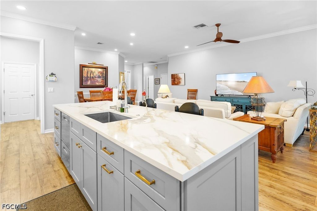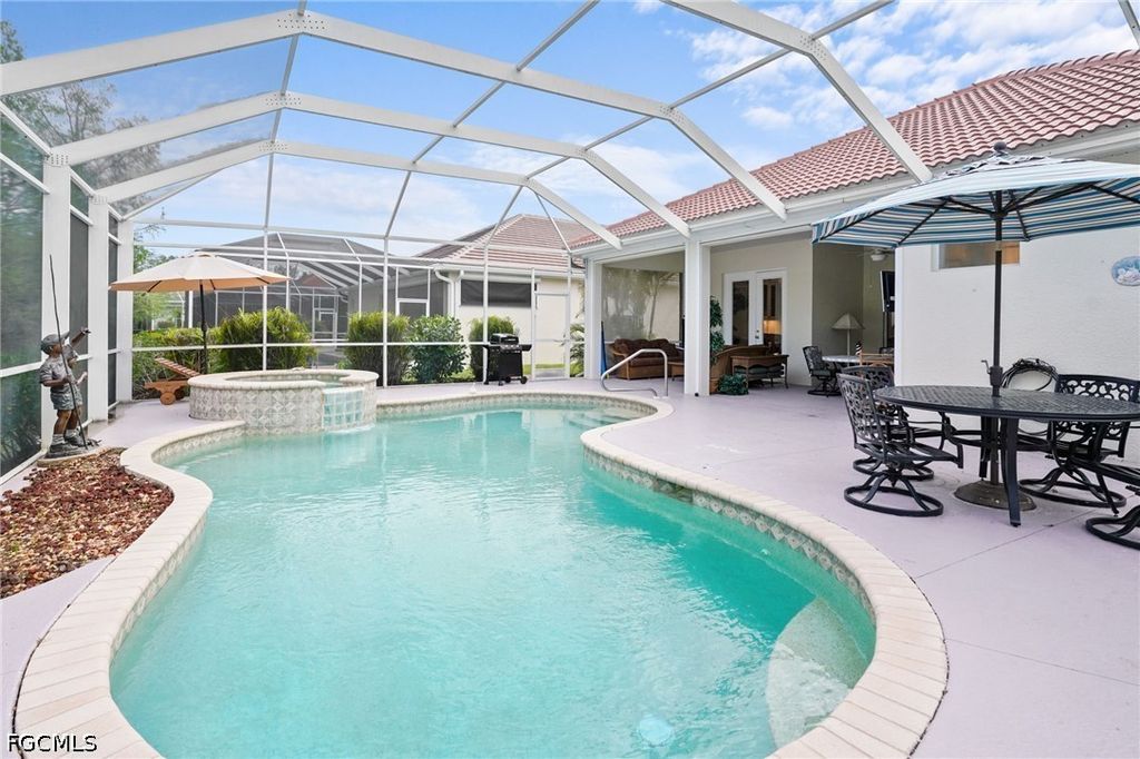 Ascot floor plan that has been completely updated with open kitchen with huge island, new cabinets, quartz counter tops, new stainless appliances, new A/C, new flooring, new roof & new baths. This is a social membership property has a private pool and spa. Legends Golf & Country Club is a beautiful guard gated Country Club that offers grand slam tennis, pickleball, a 35,000 square foot clubhouse with 3 restaurants, an amazing resort style pool with waterfall and spa, fitness center with free classes, tons of planned activities such as concerts, dances, card games and much more. Located conveniently in S. Ft. Myers close to shopping, restaurants, the airport and to the beaches or baseball games.