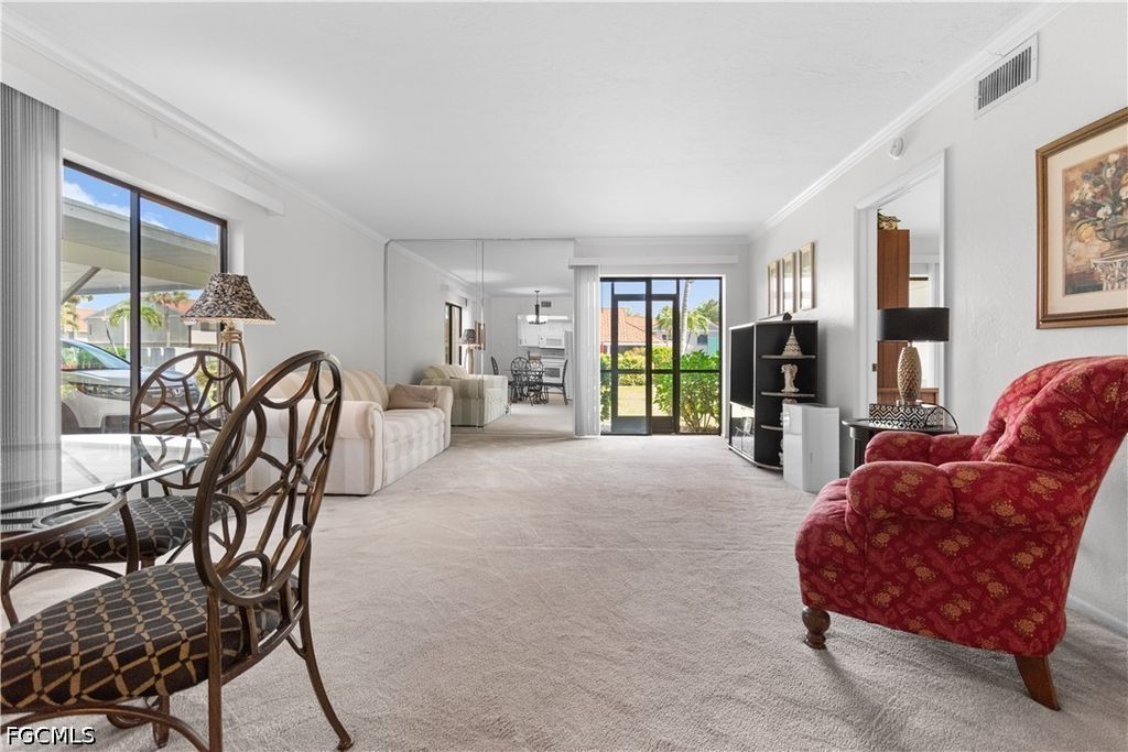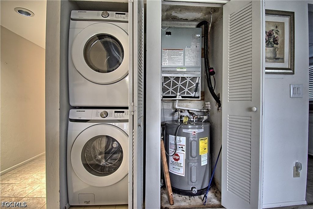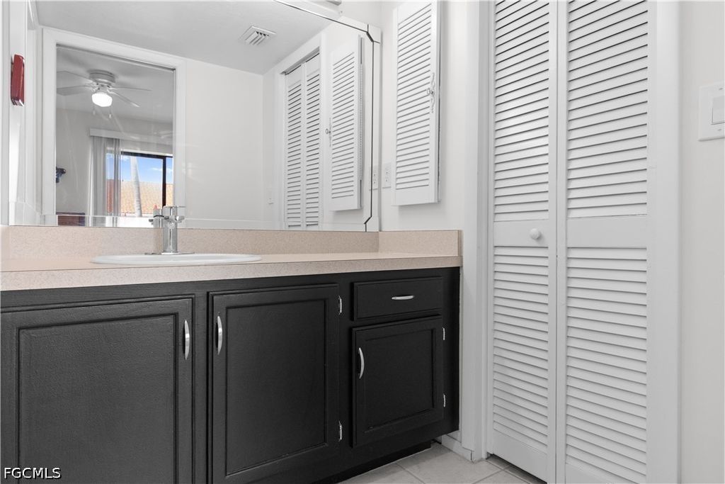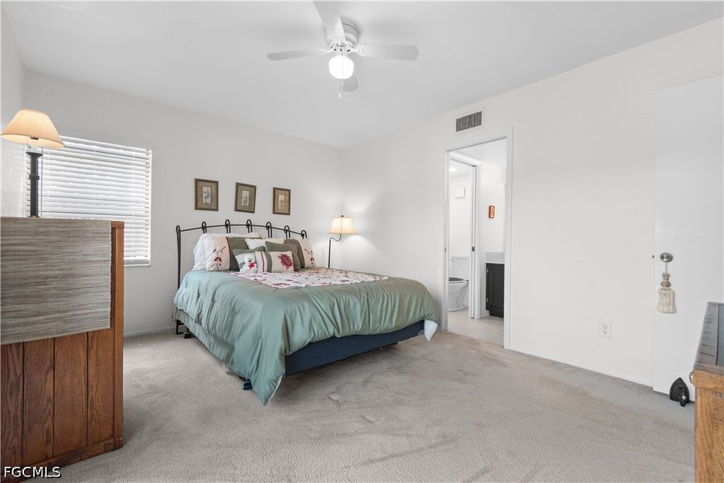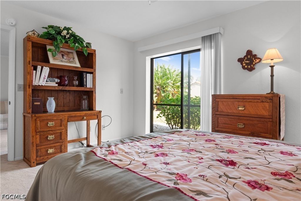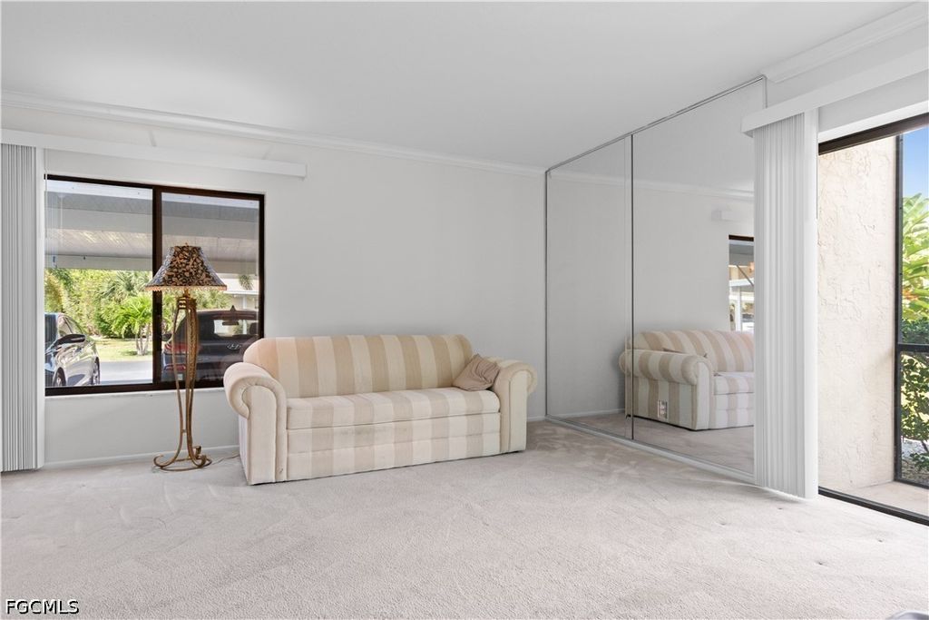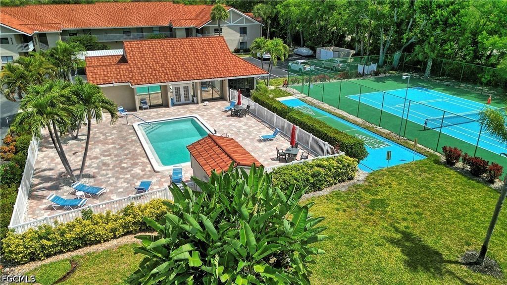 This turnkey first-floor condo is move-in ready with a new AC (2025), stackable washer and dryer (2024), and water heater (2020). The living room features crown molding and plush carpeting, with tile in the kitchen and baths. The kitchen includes solid surface counters and a pantry, and the lanai offers additional outdoor space with a storage closet. The primary suite includes a walk-in closet and ensuite bath, with a convenient half bath near the front entry. Situated in a small, intimate community, this unit is just steps from the clubhouse and pool, with covered parking and ample guest parking. Residents also enjoy access to tennis and pickleball courts and a fitness center. The location is hard to beat, just minutes from Fort Myers Beach and Sanibel Island, with easy access to Health Park Hospital, shopping, dining, Lee County Public Library, public golf courses, the Red Sox and Twins spring training facilities, and SWFL International Airport.