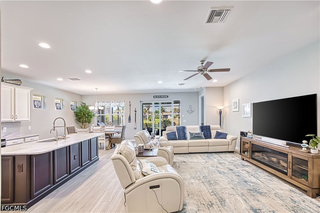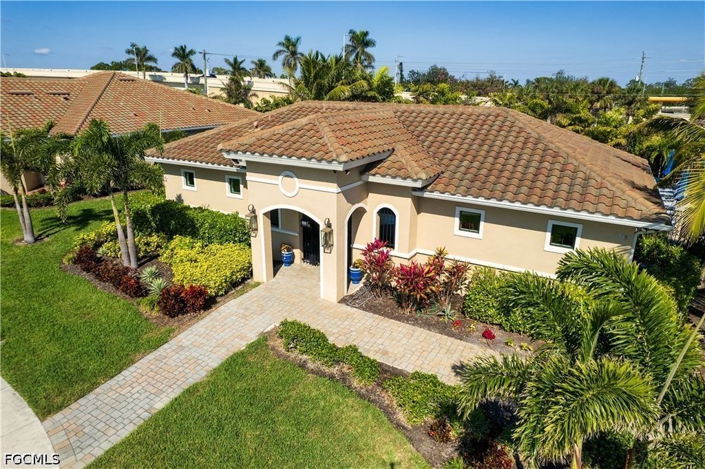 Welcome to your dream home in Fort Myers, located in the highly desirable Venetian Pointe gated community. This stunning single family- home boasts 4 spacious bedroom and 2 full bathrooms, featuring tile porcelain flooring throughout main areas. The kitchen has beautiful quartz countertops, a large island, and a wine cooler-perfect for cooking and entertaining. Natural light fills the living area through out expansive windows and sliding glass doors, creating an bright and open feel. All windows and sliding doors are storm windows. No need to put up shutters during storms! Step outside to a private backyard oasis with a heated pool and hot tub! The covered lanai boosts an outdoor kitchen. Ideally position in the center of the lake, this home offers one of the best locations in the community with stunning sunsets views, birds, and sunsets.