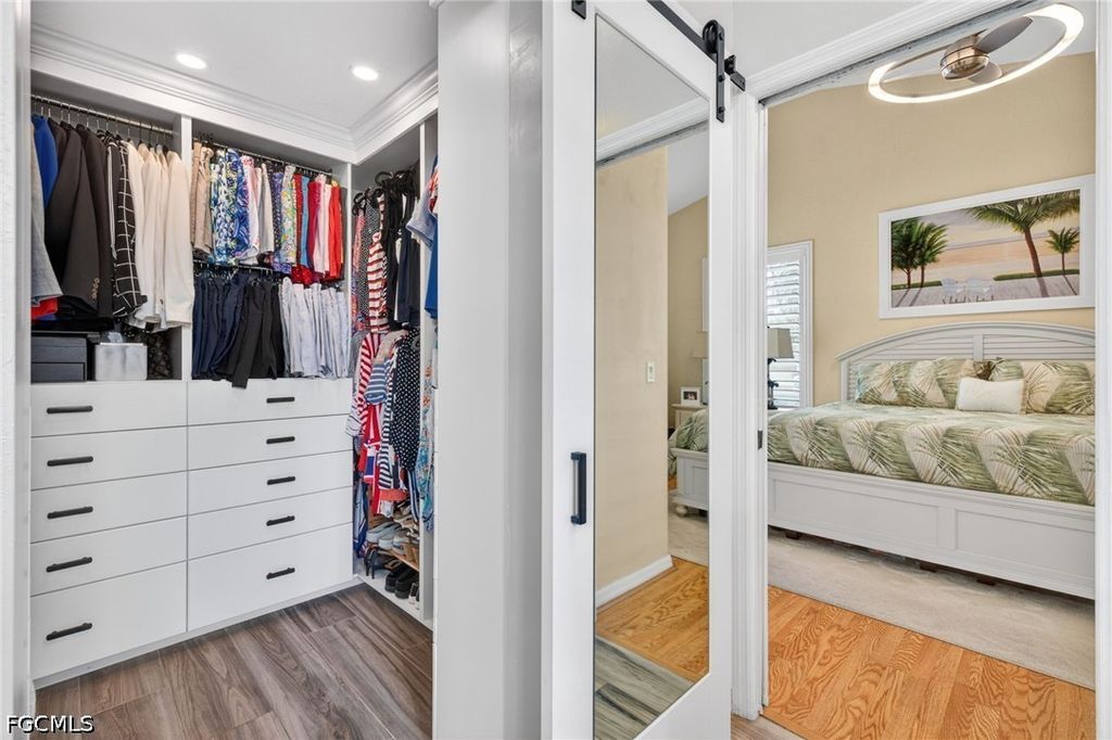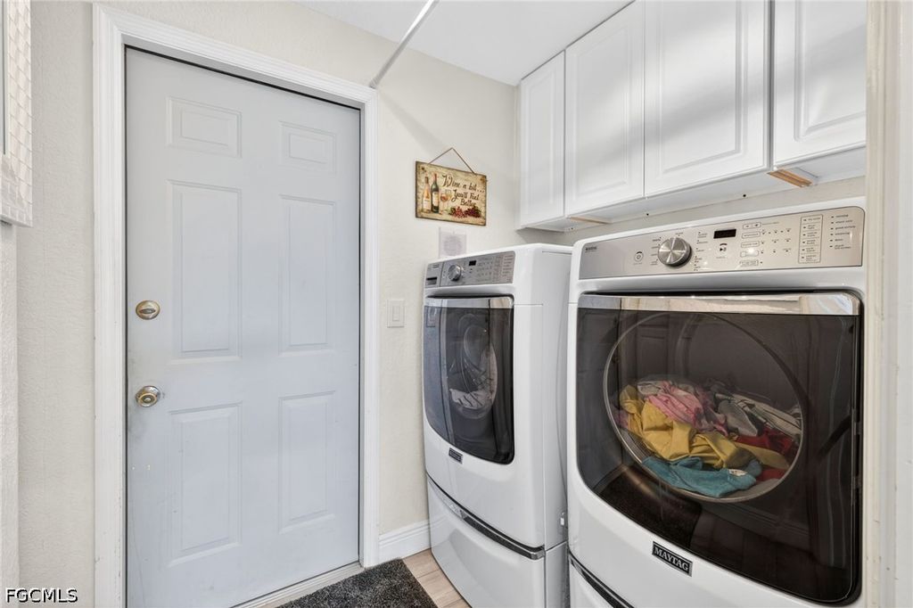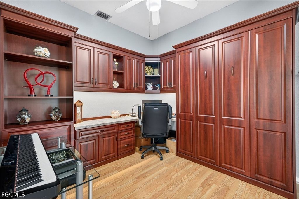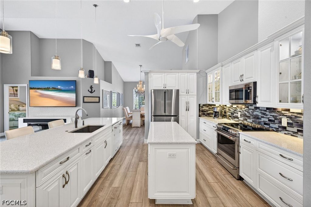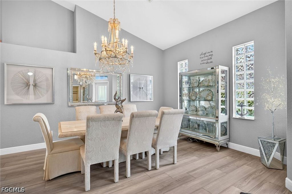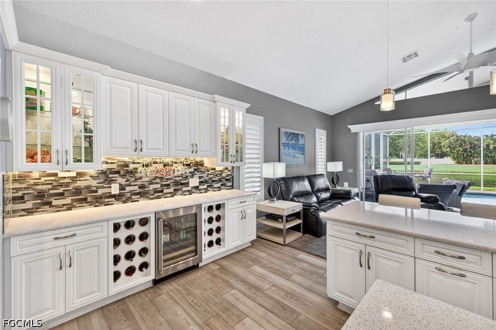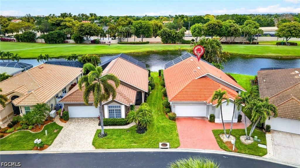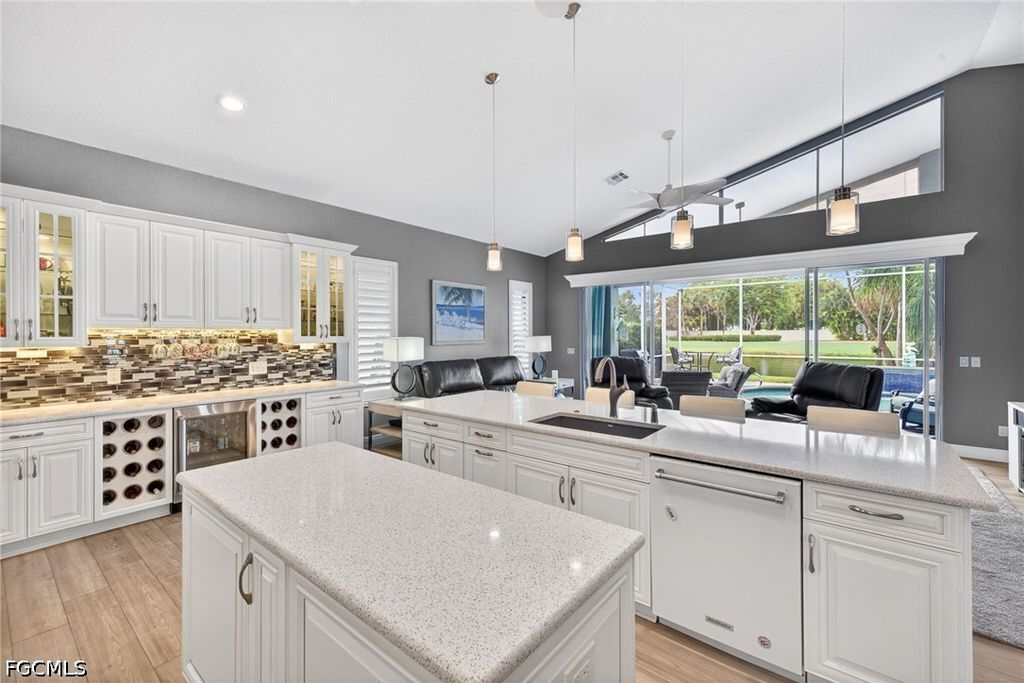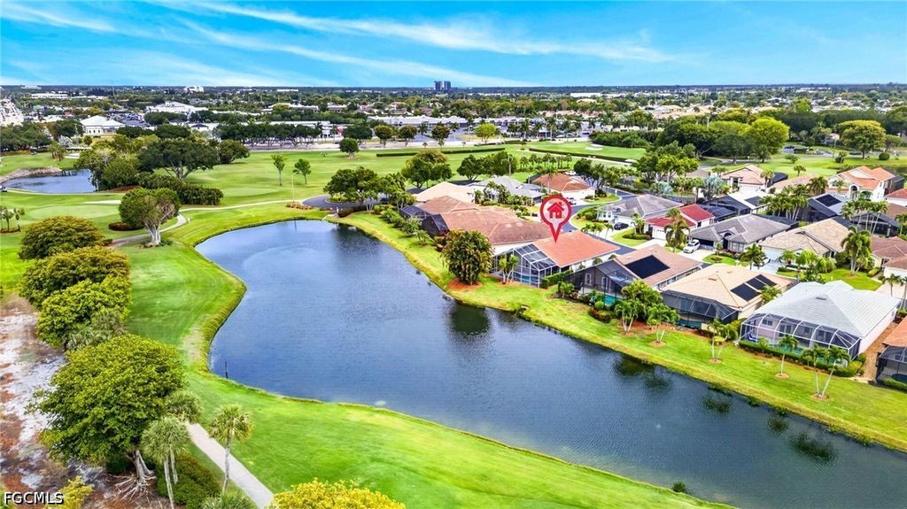 Right when you walk in, you'll be amazed with the volume ceilings and bright, open layout. The kitchen has been UPDATED with QUARTZ COUNTERS, PREP STATION, HUGE CENTER ISLAND with plenty of workspace, STAINLESS STEEL APPLIANCES WITH INDUCTION RANGE making it just as functional as it is inviting. A DRY-BAR with Built-in beverage fridge is also a perfect addition. Throughout the home, you'll find luxury vinyl plank flooring and plantation shutters that add a clean, finished look. There's great flexibility here too, a bonus flex room with a queen Murphy bed and built-in storage is perfect for guests or a home office, and the guest bedroom offers even more storage. The primary suite features an UPDATED BATHROOM with a CURBLESS WALK-IN SHOWER, giving it a modern, spa-like feel. Step outside and it only gets better. The lanai area has been recently been resurfaced, and there's even a patio set with a fire pit included, all set up to enjoy your golf course and lake views. Practical upgrades are already done for you: portable generator, hurricane shutters, impact-rated garage door, and garage floor professionally coated with ceiling-mounted storage that lowers for easy access, and Brick Paver Driveway. Located in The Landings Yacht, Golf & Tennis Club, you'll have access to an incredible lifestyle; UNLIMITED golf, tennis, pickleball, bocce, a Full-Service marina with boat slips, fitness center, walking trails, and two on-site restaurants. And when you head out, you're just minutes from the Fort Myers River District, theaters, spring training stadiums, and Southwest Florida's beautiful beaches. This is one of those homes where everything's already been done...move-in and enjoy an amazing lifestyle with all the amenities The Landings has to offer.
