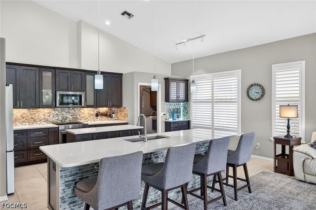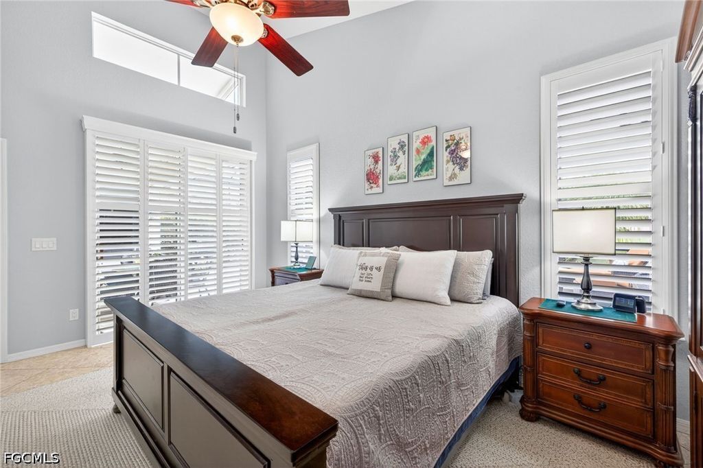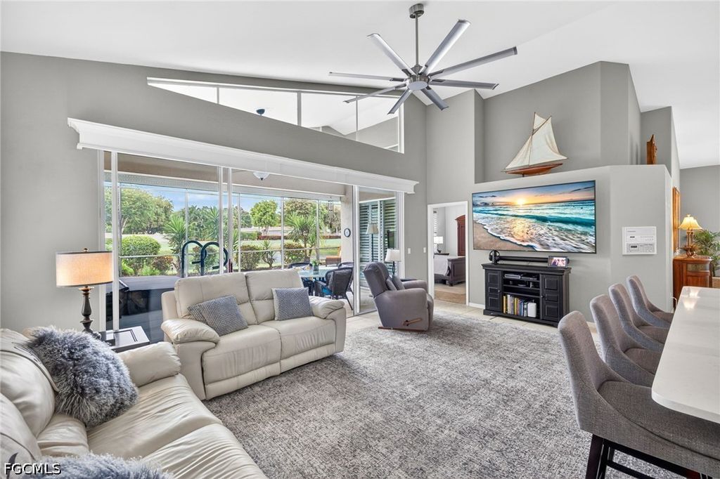 Step into soaring high ceilings that make the entire home feel open and bright**UPDATES include kitchen with QUARTZ COUNTERS, PREP STATION, HUGE CENTER ISLAND, STAINLESS STEEL APPLIANCES, INDUCTION RANGE**Built-in Dry Bar**TILE FLOORING throughout for a clean, low-maintenance feel**Flex room with a queen Murphy bed and built-in storage, perfect for guests or a home office**Guest Bedroom offers even more added storage. Custom window treatments already in place**Primary BATH UPDATE with a sleek curbless walk-in shower. This home is also dialed in when it comes to peace of mind: Whole-house generator with 500-gallon propane tank**Hurricane shutters, manual and electric**A Couple Impact Windows**Hurricane-rated garage door**Air-conditioned garage with professional floor coating, great for storage, hobbies, or just keeping things cool. Step outside and it gets even better: Resurfaced pool with solar heating**Outdoor shower**Paver driveway**Relaxing views of the golf course and lake, the kind of backdrop you don't get tired of. All of this is set inside The Landings Yacht, Golf & Tennis Club, where the lifestyle is just as impressive as the home: UNLIMITED Golf, tennis, pickleball, and bocce, Full-Service Marina with boat slips (based on availability), Fitness center, Two on-site restaurants, Scenic walking trails throughout the community. And when you leave the gates, you're minutes from the Fort Myers River District, live theaters, spring training games, and Southwest Florida's beaches. Bottom line, this is a move-in ready home with real upgrades, great views, and a community people move here for.