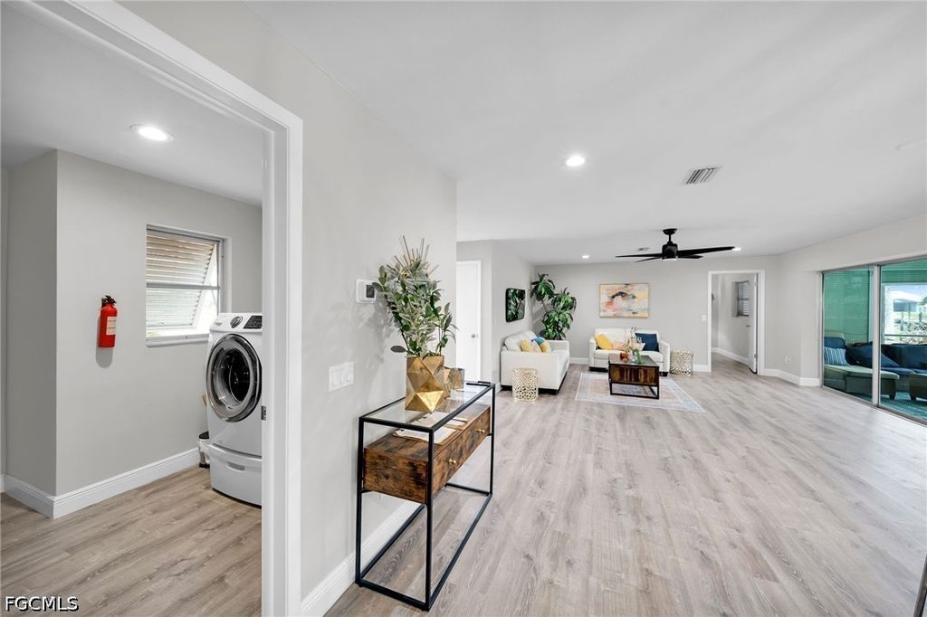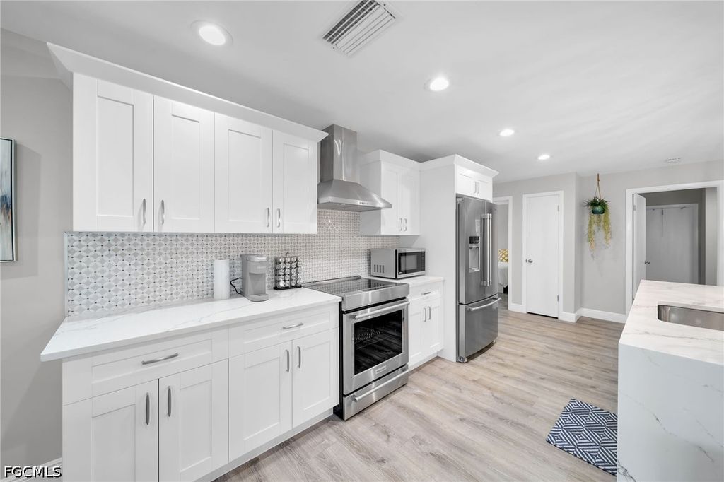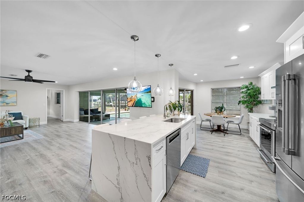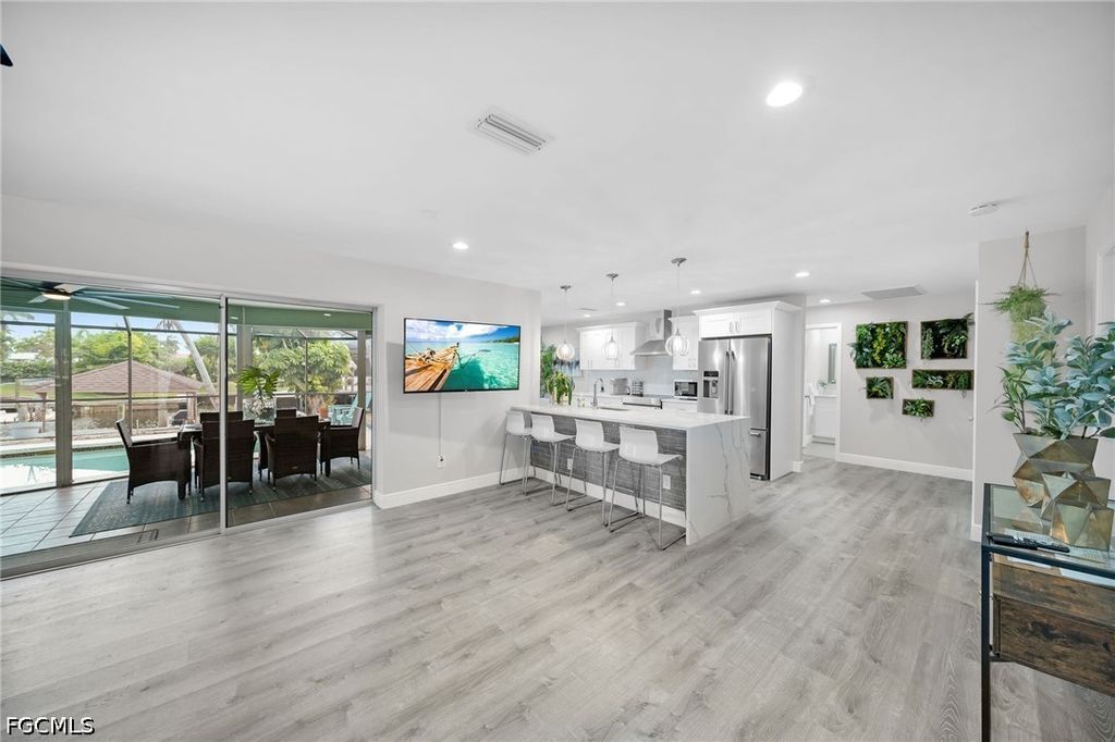 Step inside to discover a stylish, modern interior highlighted by a renovated kitchen featuring sleek quartz countertops, stainless steel appliances, and ample space for both everyday living and entertaining.