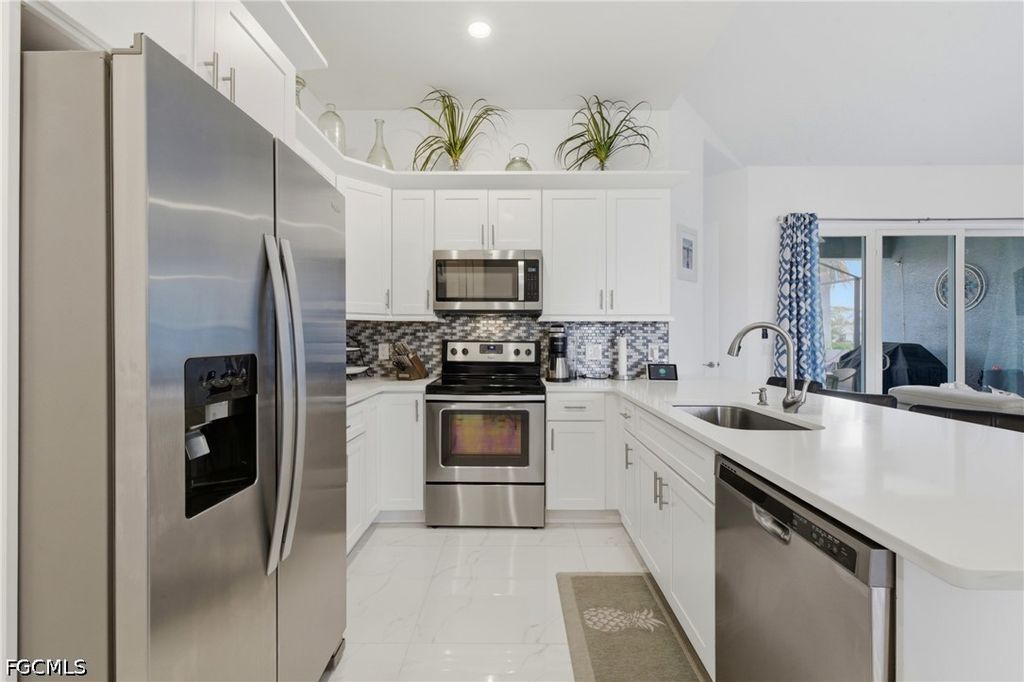 Step into this beautifully designed 4-bedroom, 2-bathroom waterfront home where contemporary finishes meet effortless Florida living. From the moment you walk in, you'll notice the seamless flow, soaring volume ceilings, and oversized 32" porcelain tile flooring that creates a sleek, cohesive look throughout.