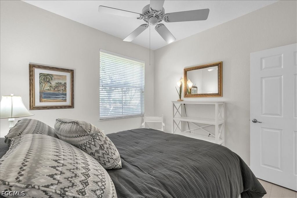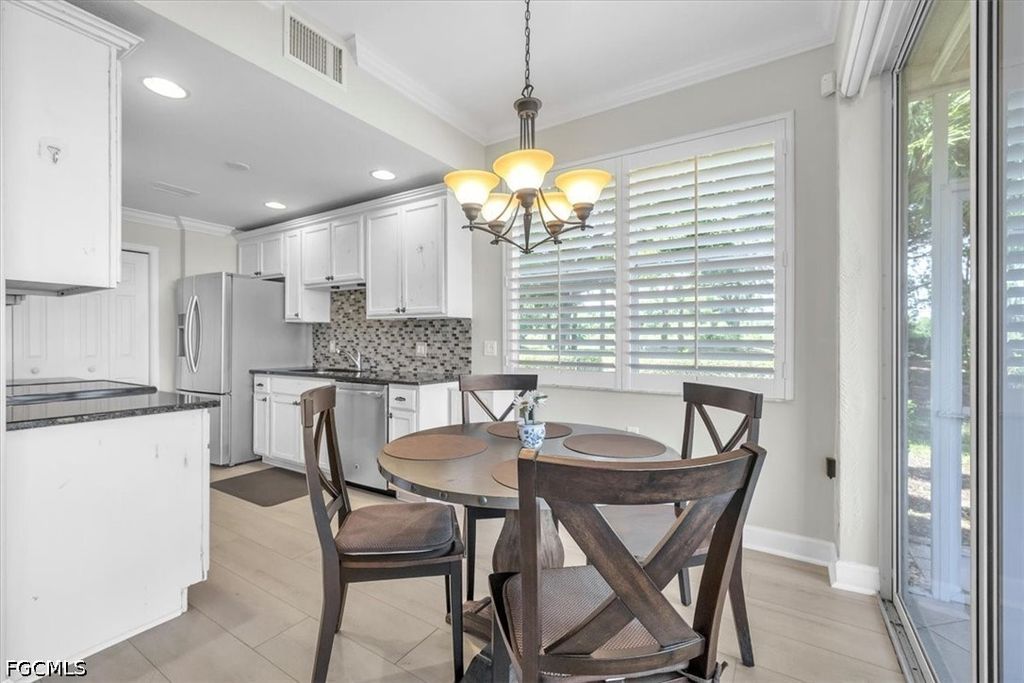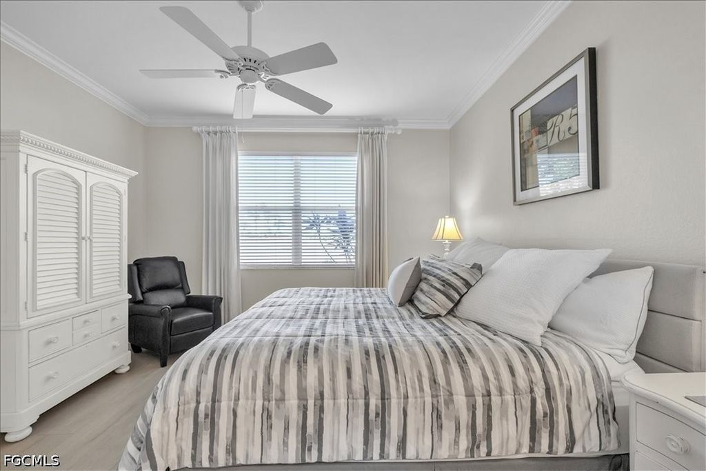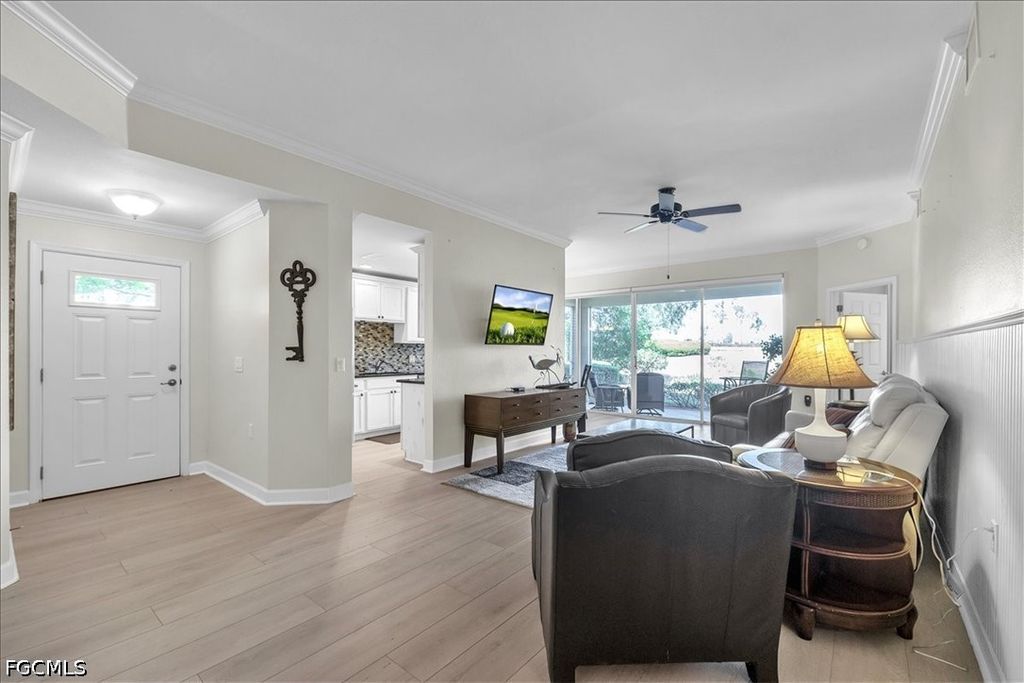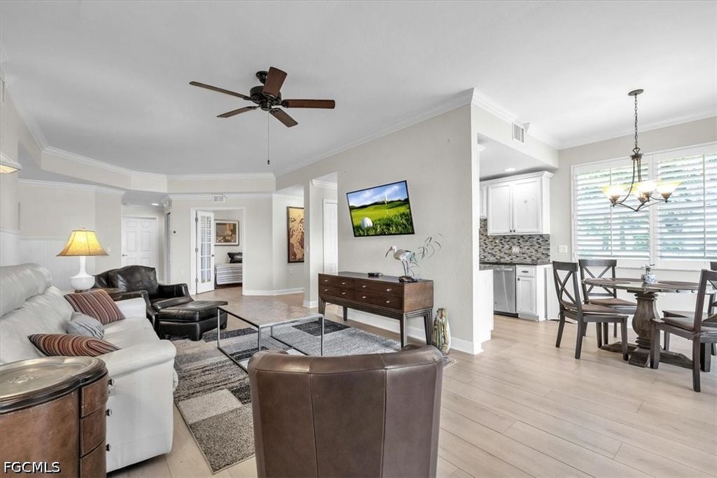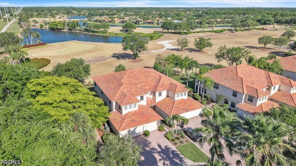 A fantastic opportunity awaits to own a piece of paradise with this 1421 sq. ft. coach home boasting stunning views of the golf course and lake. Enjoy breathtaking sunrises with the eastern rear exposure of this home. Featuring 2 bedrooms plus a den, 2 baths, and a spacious 2-car garage on the lower level, this home is move-in ready and being offered turnkey with numerous upgrades already completed. Some of the enhancements include tile and LVP flooring throughout, crown molding, white cabinets with an attractive backsplash in the kitchen, newer appliances, elegant window treatments, tray ceilings in certain areas, a picture window in the lanai to enhance the view, and more. Situated on a corner lot, this home offers added privacy. Upon entering, you are welcomed by an open family room area adjacent to the dining room, kitchen, and breakfast nook. The split bedroom layout and den provide privacy for guests from the master bedroom suite. With a 2-car garage and a large lanai offering a great view, this home has it all. Idlewild community amenities include a pool, clubhouse, and small fitness area. Roofs were replaced within the last 5 years, and all coach homes were externally painted. As a member of the Verandah Club, residents have access to a full array of amenities such as 2 championship golf courses designed by Bob Cupp and Jack Nicklaus, a tennis complex, pickleball courts, a state-of-the-art fitness center, a resort-style community pool, 9 miles of walking or biking paths, bocce courts, a playground, a dog park, kayaks on the Orange River, multiple restaurants, and a social calendar to meet everyone's needs. Come secure your place in Paradise today.