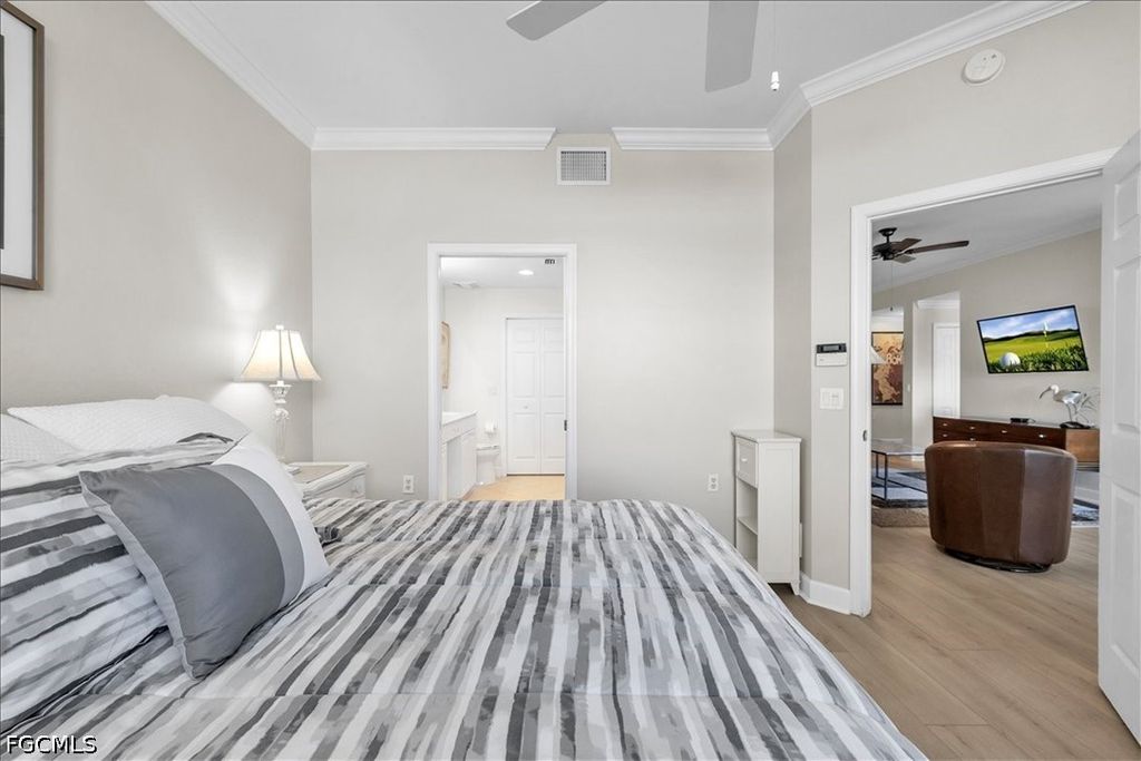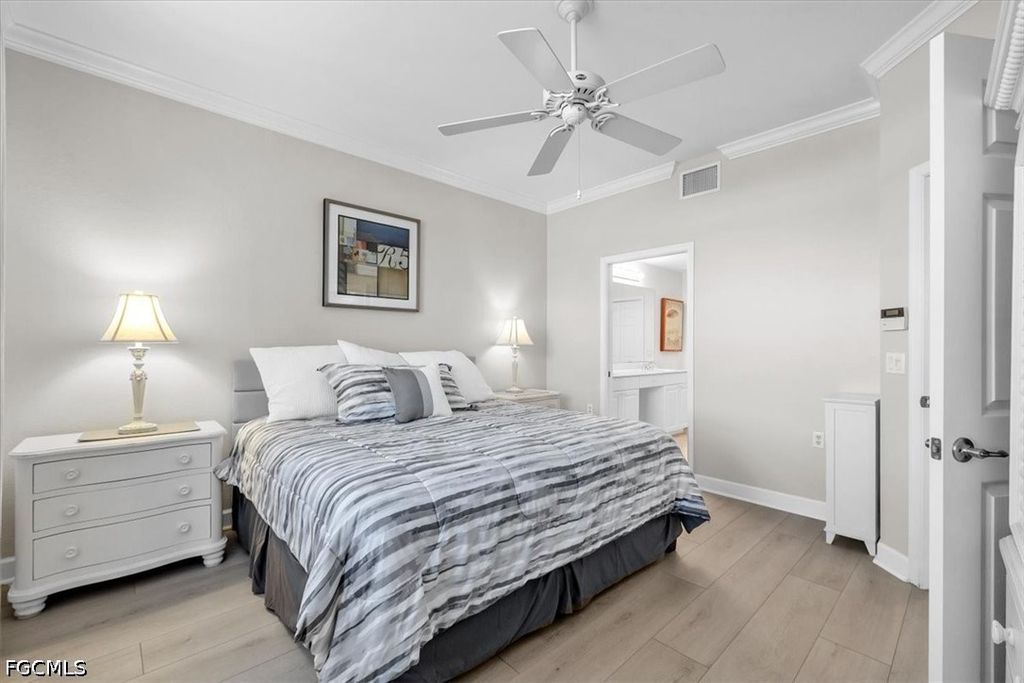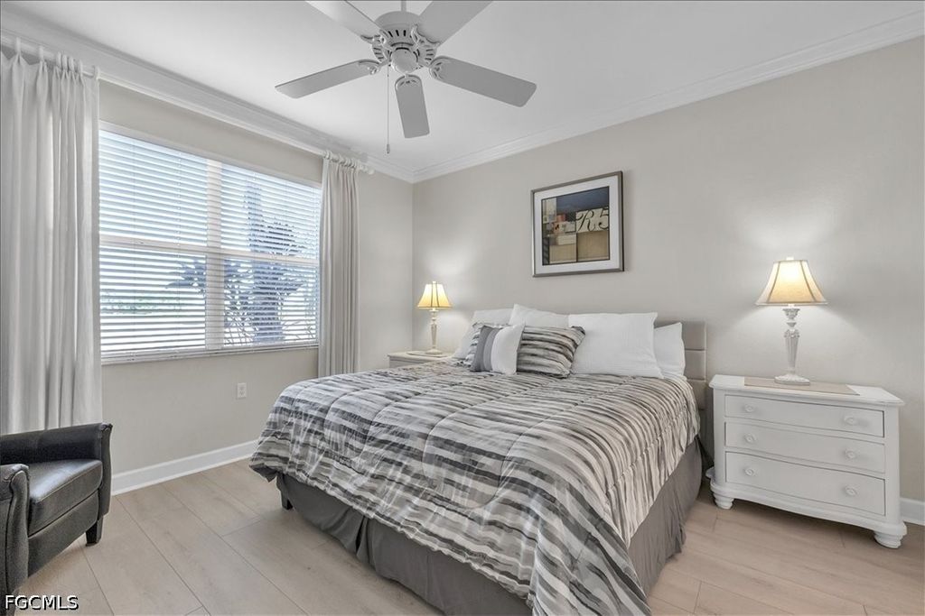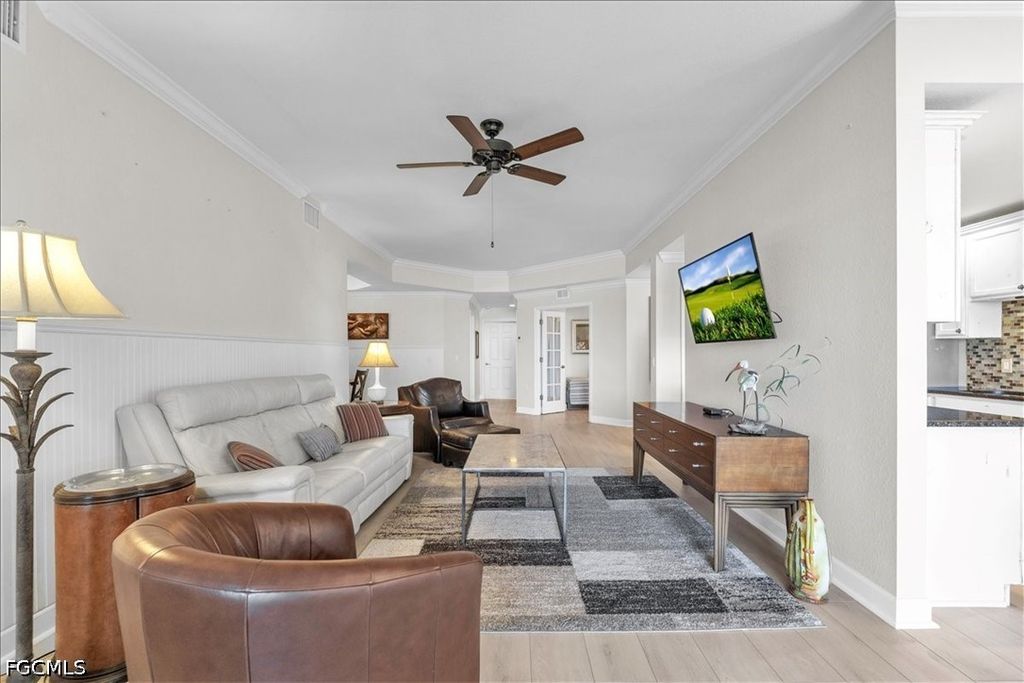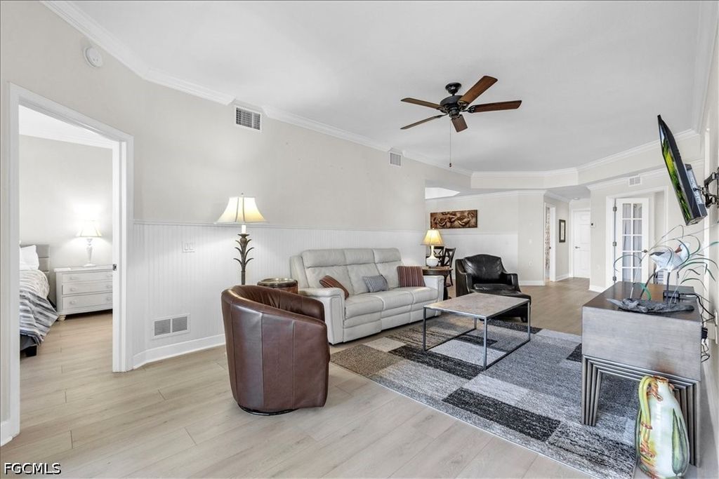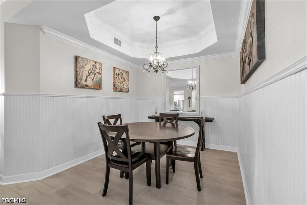 A fantastic opportunity awaits to own a piece of paradise with this 1421 sq. ft. coach home boasting stunning views of the golf course and lake. Enjoy breathtaking sunrises with the eastern rear exposure of this home. Featuring 2 bedrooms plus a den, 2 baths, and a spacious 2-car garage on the lower level, this home is move-in ready and being offered turnkey with numerous upgrades already completed. Some of the enhancements include tile and LVP flooring throughout, crown molding, white cabinets with an attractive backsplash in the kitchen, newer appliances, elegant window treatments, tray ceilings in certain areas, a picture window in the lanai to enhance the view, and more. Situated on a corner lot, this home offers added privacy. Upon entering, you are welcomed by an open family room area adjacent to the dining room, kitchen, and breakfast nook. The split bedroom layout and den provide privacy for guests from the master bedroom suite. With a 2-car garage and a large lanai offering a great view, this home has it all. Idlewild community amenities include a pool, clubhouse, and small fitness area. Roofs were replaced within the last 5 years, and all coach homes were externally painted. As a member of the Verandah Club, residents have access to a full array of amenities such as 2 championship golf courses designed by Bob Cupp and Jack Nicklaus, a tennis complex, pickleball courts, a state-of-the-art fitness center, a resort-style community pool, 9 miles of walking or biking paths, bocce courts, a playground, a dog park, kayaks on the Orange River, multiple restaurants, and a social calendar to meet everyone's needs. Come secure your place in Paradise today.