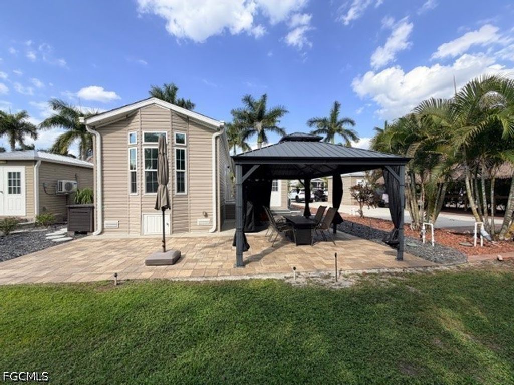 Picture yourself enjoying this 2019 champion Open concept Park Model and right around the corner is a 12,000 square-foot Cypress Trail clubhouse in this gated community. Cypress Trail is professionally managed and your HOA dues include a Fiberoptic Internet with 70+ high definition television channels, sewer, water and garbage. T his concrete lot is facing north east and has enough parking for 2 vehicle's. There is a fully screened in front porch that is approximately 10×13' with twin double doors to open it completely into the main living area. The porch has four crank down shades and three pulldown shades for Sun protection and privacy. If your used to RVing this Park Model offers a direct line to the sewer system so there is no more black or gray tanks. Inside the park models contains one bedroom with a king size bed and a 55" flat screen TV and outside the bedroom is one bath that includes a nice sink, a countertop with extra cabinets and a full-size shower with double doors and handicapped handrails. Included is a kitchen with a large countertop, twin aluminum sinks, a full-size smooth stove top with a full oven, an over the oven microwave and a full size dishwasher. There is plenty of storage available for your perishables including a double door refrigerator/freezer. For your viewing pleasure the living room offers a 55 inch flatscreen TV. Throughout the Park Model is large light gathering high windows and loads of cabinet space. The electrical system is protected by DITEK brand surge protection throughout the house. Notice, the nice looking plank flooring throughout this home. The rear door will lead you out to the back patio where you will find an 11 x 16"˜ gazebo with full length, sliding curtains, nice neutral colored Pavers. On the pad is an Amazon Shed that is 8 x 15' complete with a washer/dryer rough-in and a mini split that can go between air and heat and a 32 flatscreen TV. You step in or out of the shed on very nice steps and the porch is made of maintenance free TREK style material. Throughout the lot is medium grey stones.