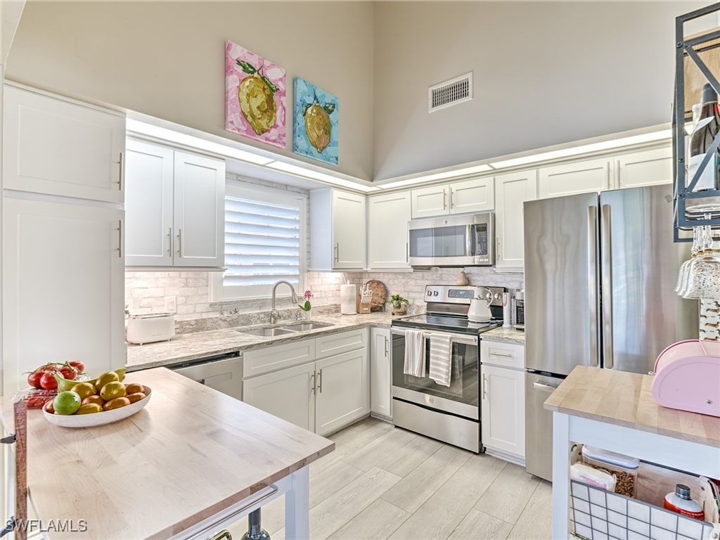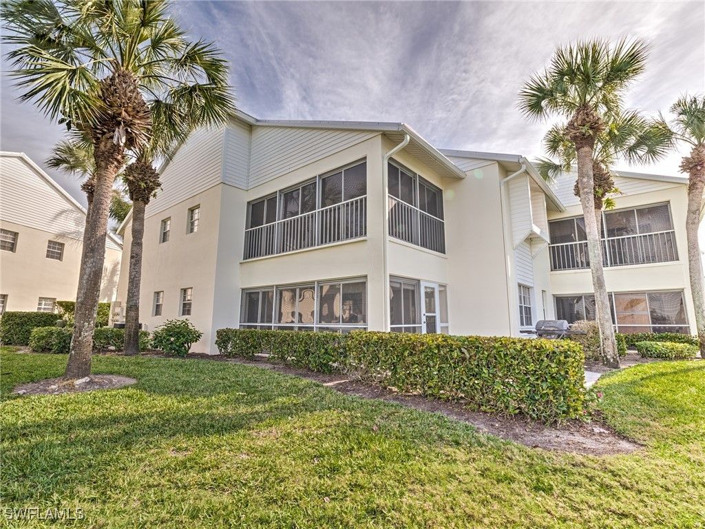 Charming 3-bedroom 2 bath condo located in Rivers Edge at Gulf Harbour offering a western exposure with lake and golf course views. The vaulted ceilings and open concept design allow this unit a much greater volume providing a spacious and relaxing retreat. The recently remodeled kitchen, master bath, and new flooring provide for that brand new feeling. Primary bedroom offers a walk-in closet, comfort height vanity, and a walk-in shower. Second and third bedrooms share a recently updated bathroom with a shower/tub combo. Third bedroom provides built in shelving and desk with a Murphy Bed. The two large sliders provide an effortless transition from indoor to out while enjoying amazing sunsets from the patio. Newer HVAC, 2022.