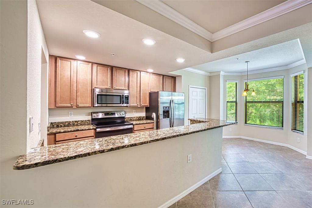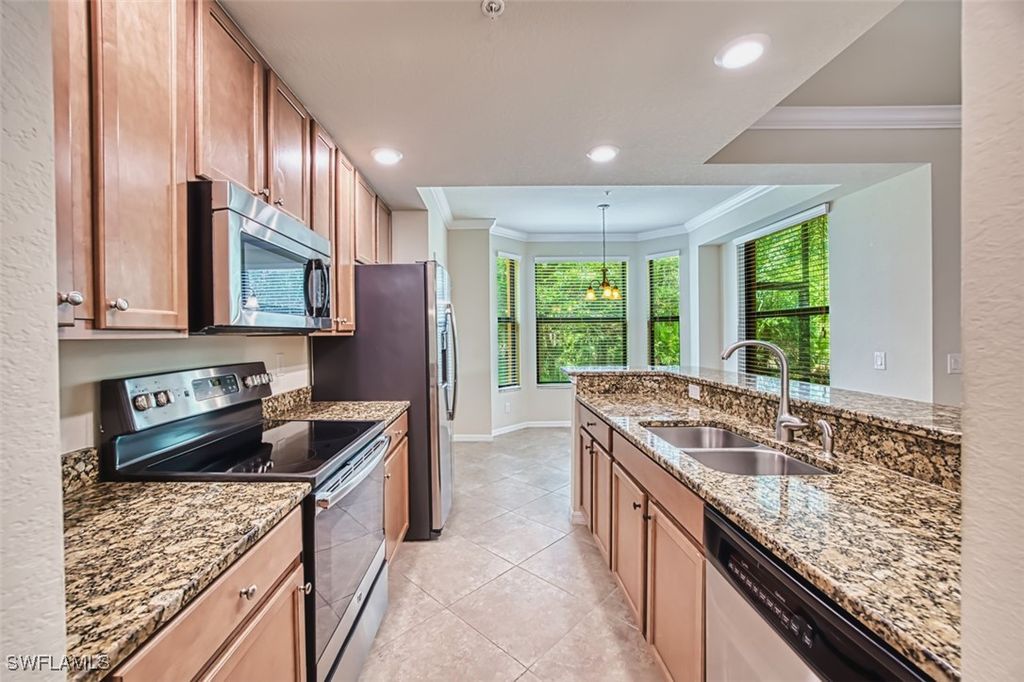 The primary bedroom is spacious and features two walk-in closets, dual vanities, and a walk-in shower. From the living area, sliding glass doors take you out to a second screened lanai, where you can kick back and enjoy the quiet preserve and maybe catch a glimpse of some wildlife.
