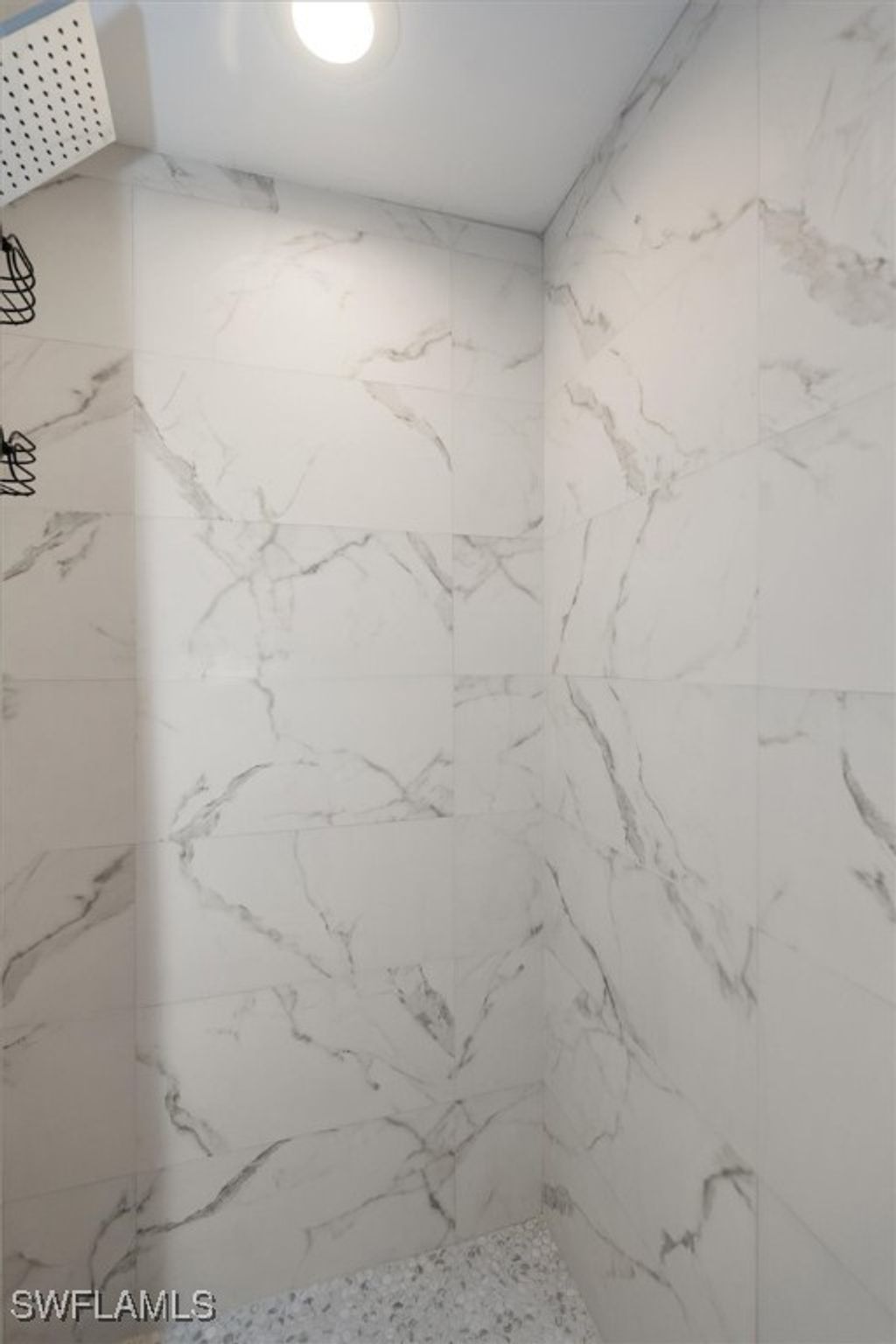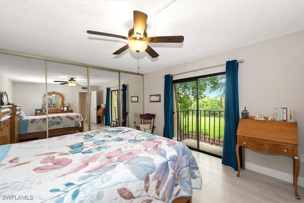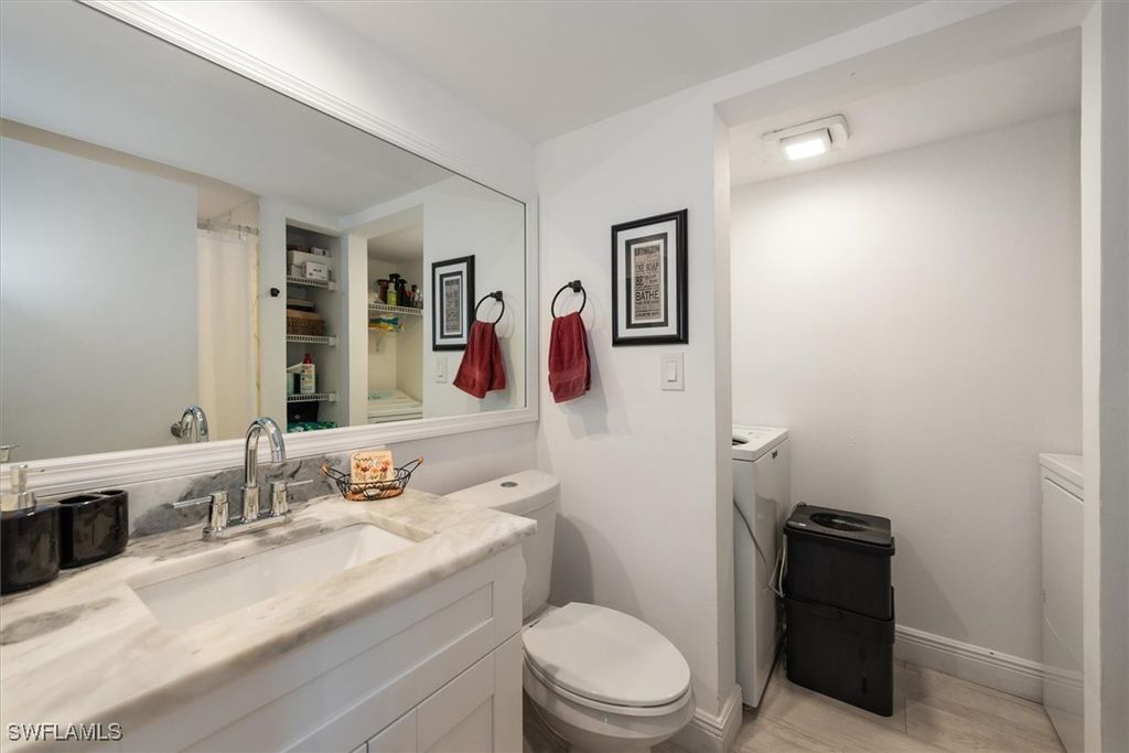Both bathrooms have been tastefully renovated, with the upstairs offering dual vanities, quartz and quartzite counters, and a restored tub/shower combo. The downstairs bath features a custom-tiled walk-in shower. The updated staircase leads to two spacious bedrooms, each with its own private balcony overlooking the peaceful park-like setting behind the home.