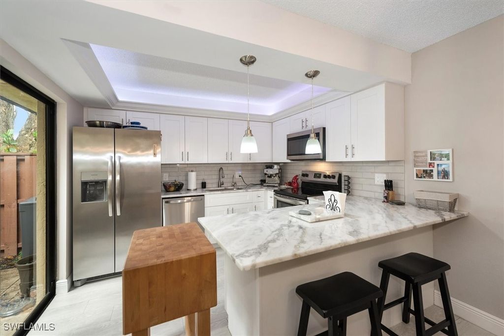 Inside, you'll find wide plank flooring throughout and a modern kitchen with white shaker cabinets, quartzite countertops, subway tile backsplash, stainless steel appliances, and a custom tray ceiling with LED accent lighting and pendant fixtures.
