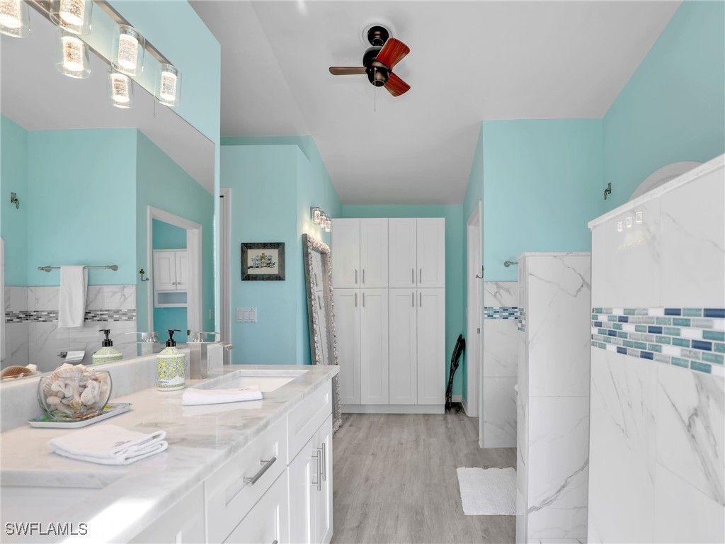 The primary suite is your retreat, boasting a luxurious soaking tub, tiled walk-in shower, double vanities with extra cabinetry, and a gorgeous Blue Piscine Dolomite marble counter. Plantation shutters add both charm and privacy.